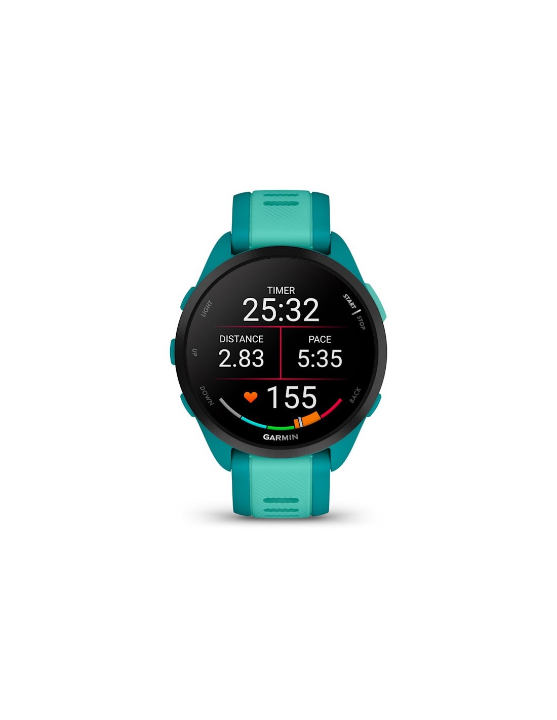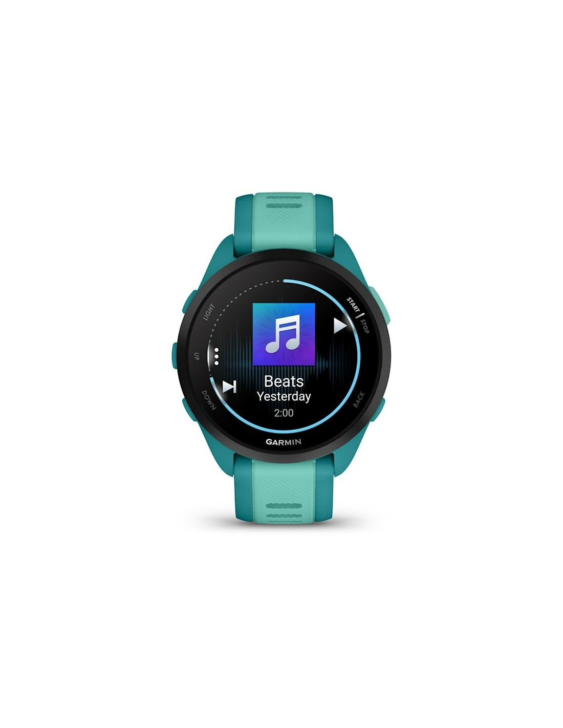 Garmin Forerunner 165 Music. Diagonal de la pantalla: 3,05 cm (1.2"), Tecnología de visualización: AMOLED, Resolución de la pantalla: 390 x 390 Pixeles, Pantalla táctil. Memoria flash: 4 GB. GPS (satélite). Peso: 39 g. Material de la banda: Silicona, Color de banda: Azul, Turquesa