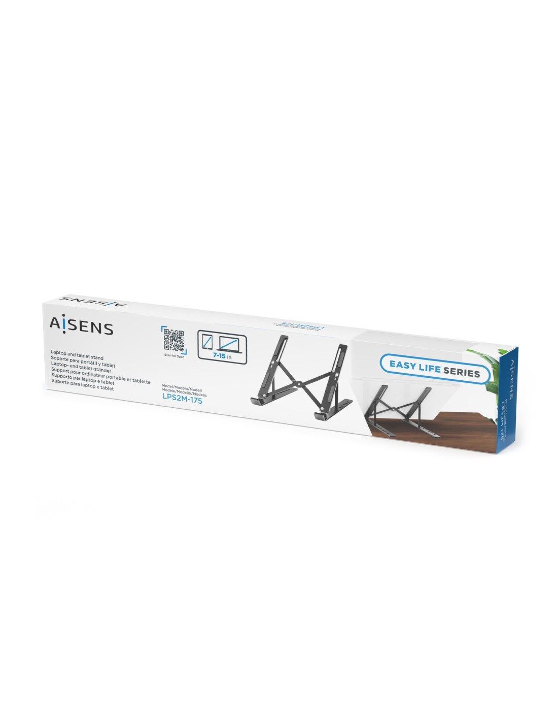 AISENS Soporte de Sobremesa Ajustable para Portatil / Tablet, Gris. Tipo de producto: Soporte para ordenador portátil y tableta, Color del producto: Gris, Material: Aluminio. Longitud: 251 mm. Ancho del paquete: 270 mm, Profundidad del paquete: 50 mm, Altura del paquete: 26 mm. Contenido del paquete: 1 x Soporte de sobremesa plegable y ajustable para portátil o Tablet 1 x Funda para soporte. Ancho de la caja principal: 270 mm, Longitud de la caja: 275 mm, Alto de la caja principal: 280 mm