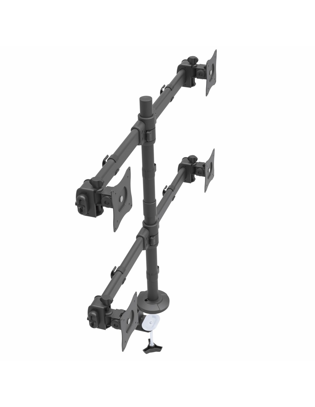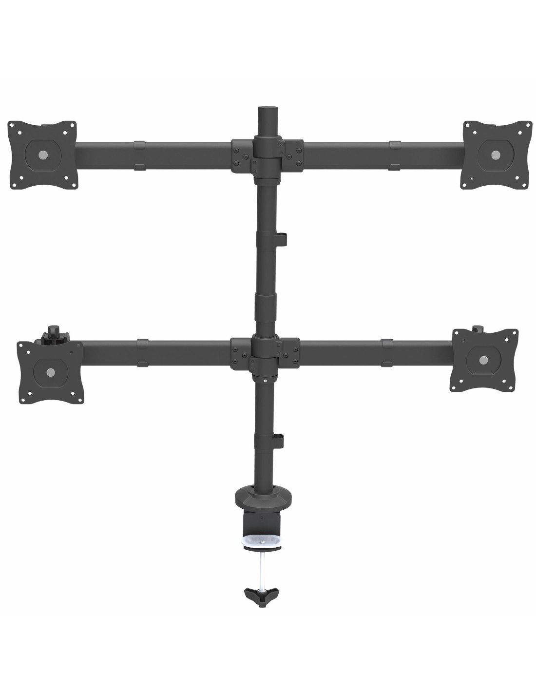Libere espacio valioso para el montaje de cuatro monitores en una base, a fin de suspenderlos encima de la superficie de su escritorio, estación de trabajo o mesa. Este resistente brazo para monitor cuádruple y montaje en escritorio/mesa, de acero macizo, soporta cuatro pantallas de forma segura, para crear un espacio de trabajo impresionante y productivo. Mejore su productividad a la vez que ahorra espacio Cree lo último en estación de trabajo mediante el montaje de cuatro monitores en una base que se instala de forma segura sobre su escritorio, mesa u otra superficie. Puede ver varias pantallas a la vez, a fin de trabajar de manera más eficiente y ahorrar más espacio. Este brazo para monitor cuádruple mejora la productividad en numerosas aplicaciones de oficinas y comerciales, como en entornos de bancos y finanzas, ya que permite comparar documentos y analizar los datos más eficazmente. También resulta ideal para desarrolladores de software, programadores, diseñadores CAD y otros profesionales. También puede crear atrayentes pantallas de señalización digital para comunicarse con sus clientes o empleados. Diseño de acero resistente Gracias a su fabricación para servicio pesado, de acero macizo, el soporte para monitor cuádruple sostiene de forma segura sus monitores y garantiza un rendimiento duradero. Cada brazo de monitor es capaz de soportar una pantalla plana de 13" a 27" (330 a 686 mm) de tamaño y 8kg de peso. Ajuste los monitores a la posición de visualización ideal Puede ajustar la posición y el ángulo de sus monitores para que su visualización resulte más confortable, con posibilidad de entre +30° a -30° de giro e inclinación. El soporte para monitor cuádruple permite una fácil inclinación, lo cual reduce los reflejos y permite ajustar la visualización al ángulo ideal. Para una alineación más precisa, el brazo para monitor permite microajustes que le permiten alinear a la perfección sus pantallas. Fácil instalación El soporte de monitor tiene capacidad para cuatro monitores compatibles con VESA y es fácil de instalar mediante la pieza de sujeción al escritorio/mesa o el ojal. Para mantener sus cables organizados y ocultos, este brazo incluye clips para la gestión de cables que le ayudarán a mantener en orden su estación de trabajo.