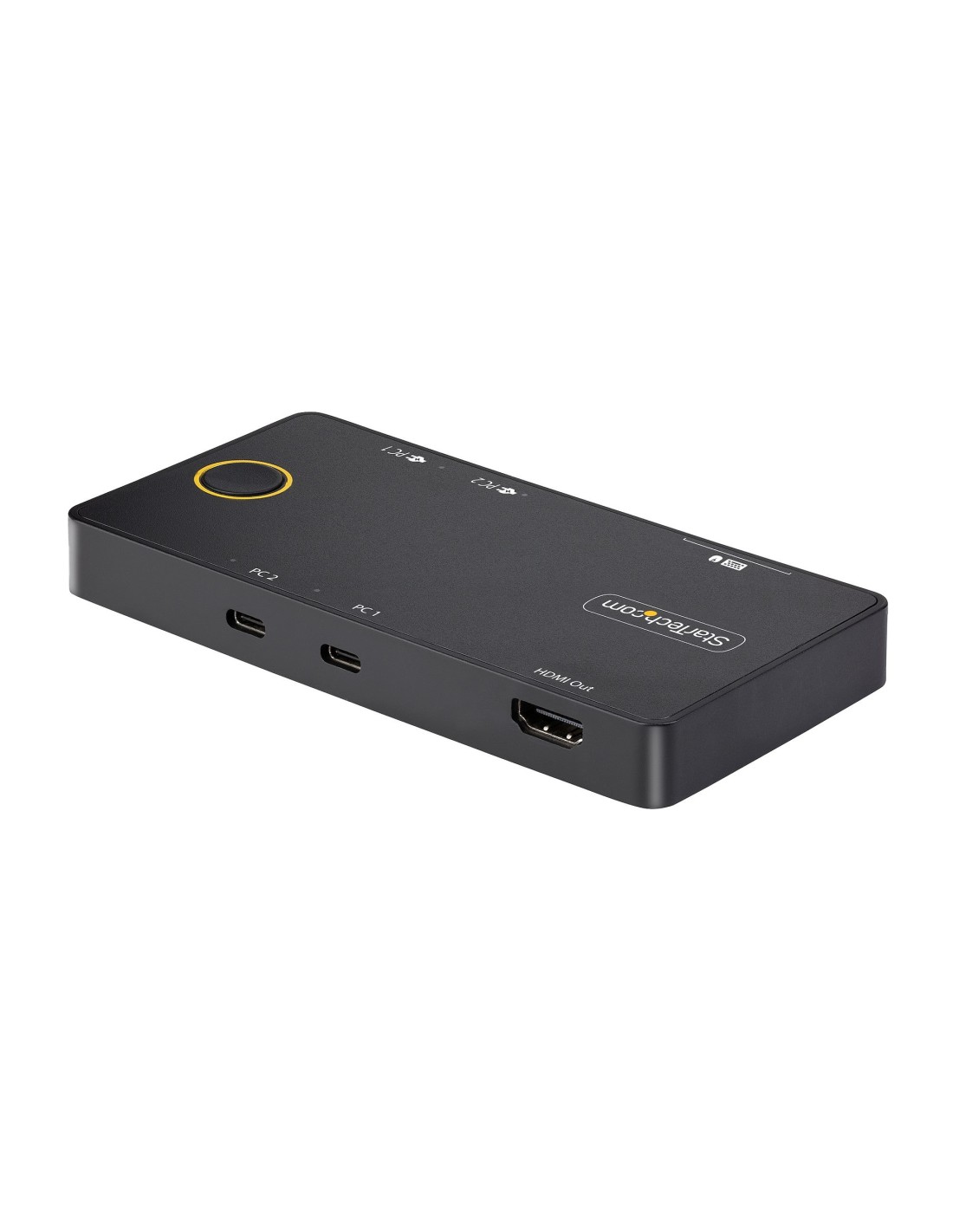 El conmutador KVM se alimenta por bus e incluye dos cables host USB-C de 1m/3 pies, lo que permite un despliegue rápido. El pequeño factor de forma es robusto y cuenta con pies de goma acoplados, que mantienen el KVM firmemente en su sitio durante el uso. La disposición simplificada de los puertos garantiza un fácil acceso al ratón, al teclado y a las conexiones del host, mientras que el paso de DP y la salida HDMI están convenientemente apartados, situados en el otro lado de la unidad.