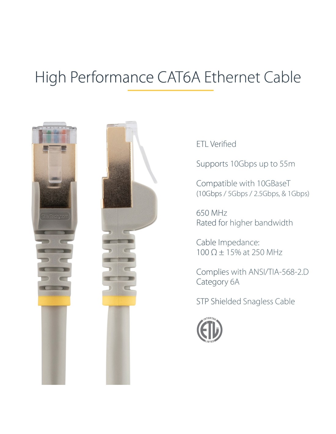 StarTech.com Cable 7m Ethernet CAT6a - Cable de Red de 10 Gigabits Blindado Snagless RJ45 PoE de 100W - Latiguillo STP de 10GbE con Alivio de Tensión - Fluke - UL - TIA - Gris. Longitud de cable: 7 m, Cable estándar: Cat6a, Blindaje de cable: S/UTP (STP), Conector 1: RJ-45, Conector 2: RJ-45, Contactos del conector chapado: Oro, Velocidad de transferencia de datos: 10000 Mbit/s, Color del producto: Gris