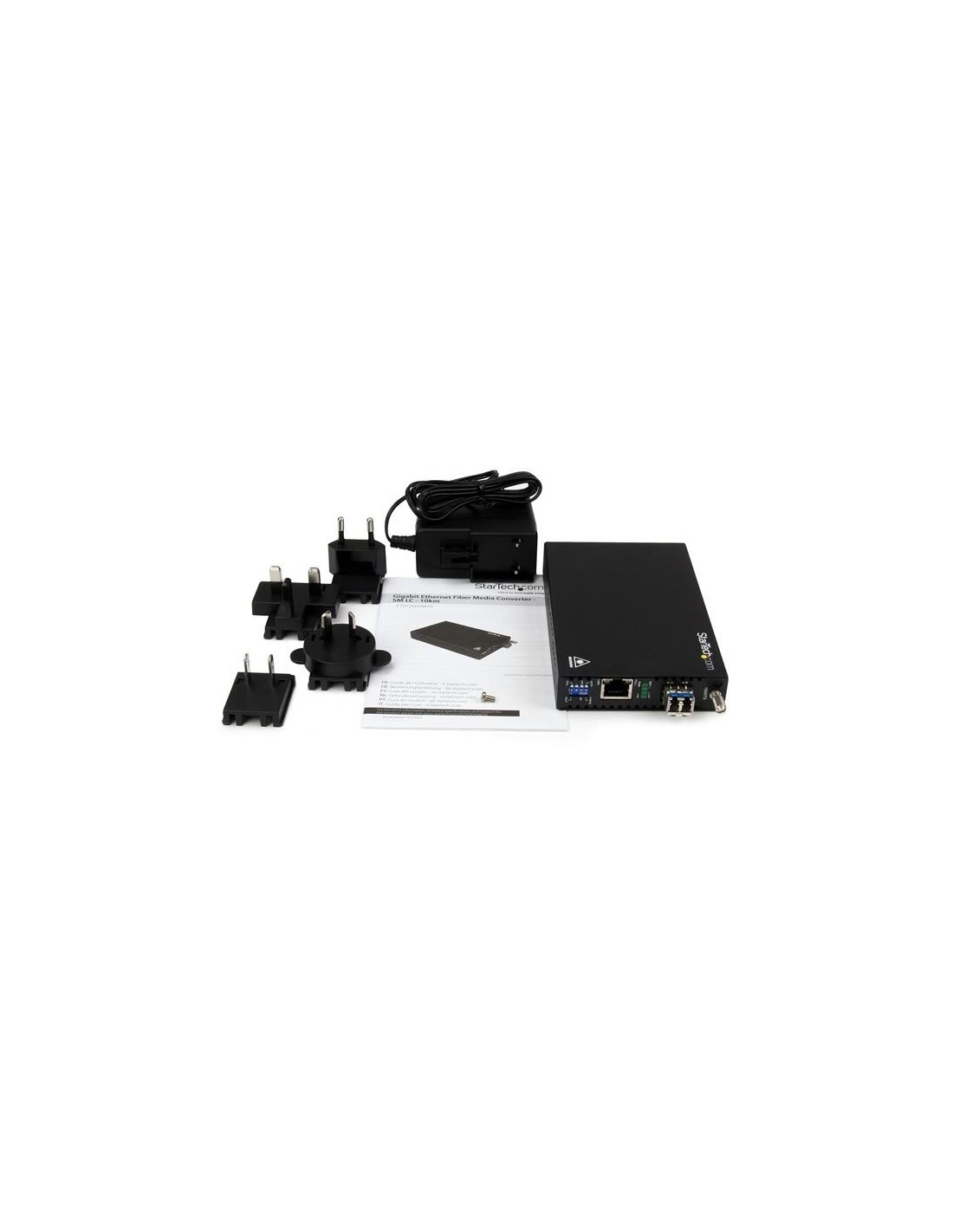 StarTech.com Conversor de Medios de Ethernet Gigabit de Cobre a Fibra - Monomodo LC - 10km. Rango máximo de transferencia de datos: 2000 Mbit/s, Interfaz de convertidor de entrada: 1000Base-T, Interfaz de convertidor de salida: 1000Base-LX. Distancia de transferencia máxima: 10000 m, Longitud de onda: 1310 nm, Estructura de modo de fibra: Monomodo. Indicadores LED: Enlace, Poder, Color del producto: Negro, Material de la carcasa: Plástico, Acero. Conector fibra óptica: LC, Tecnología de conectividad: Alámbrico. Voltaje de entrada: 100 - 240 V, Corriente de entrada: 0.48 A, Voltaje de salida: 12 V