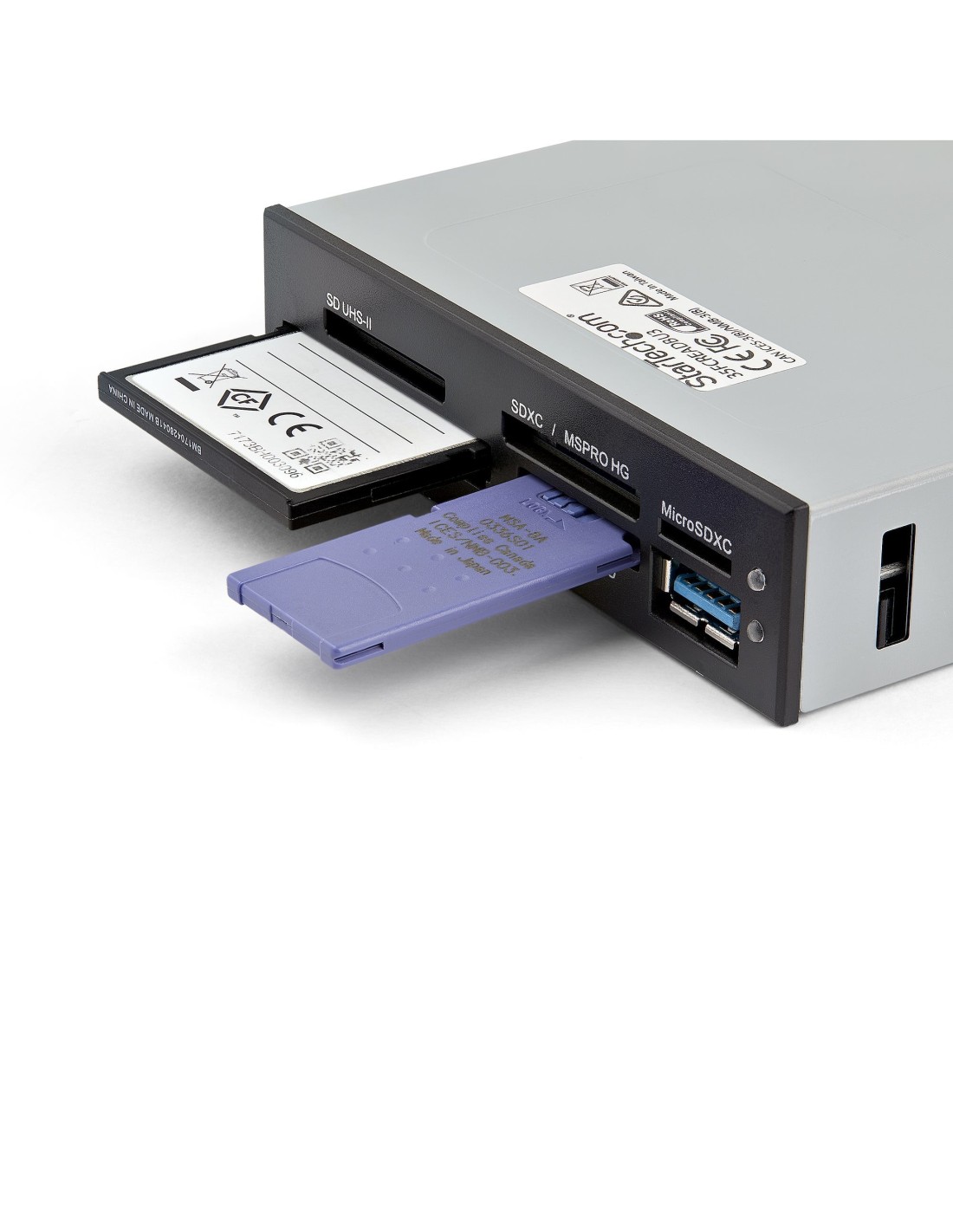 StarTech.com Lector Interno USB 3.0 para Tarjetas Memoria Flash con Soporte para UHS-II. Tarjetas de memoria compatibles: CF, Memoria extraíble, MicroSD (TransFlash), MicroSDHC, MiniSD, MMC, MS Duo, MS Micro (M2), MS..., Color del producto: Negro, Metálico, Velocidad de transferencia de datos: 5000 Mbit/s. Interfaz: IDC. Ancho: 100 mm, Profundidad: 118 mm, Altura: 24 mm. Ancho del paquete: 138 mm, Profundidad del paquete: 165 mm, Altura del paquete: 43 mm. Cantidad por caja: 40 pieza(s), Ancho de la caja principal: 333 mm, Longitud de la caja: 451 mm