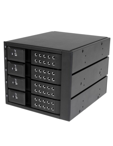 Conecte e intercambie en caliente cuatro discos duros SATA III o SAS II de 3;5" en su sistema informático en tres bahías de 5;25"; con soporte para velocidades de transferencia de hasta 6 Gbps