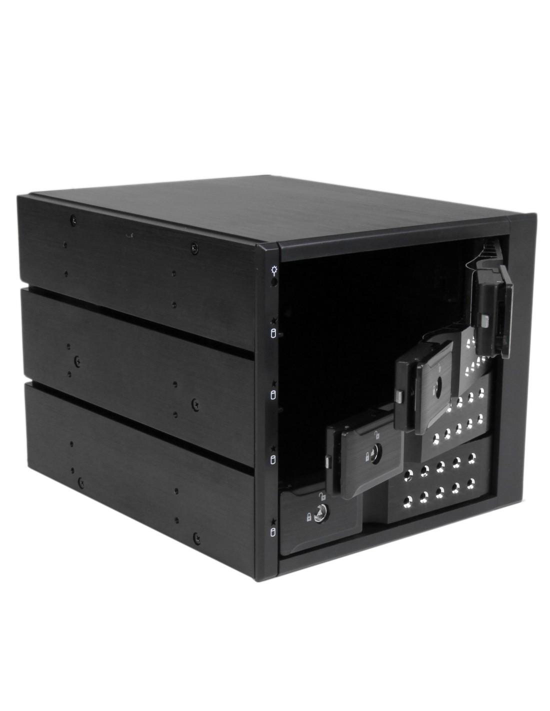 Para un método rápido y seguro de instalación y extracción de las unidades, la placa base cuenta con palancas de expulsión y un diseño de bloqueo con llave. Para ayudar a prevenir fallos en las unidades, la bahía proporciona refrigeración de las mismas con un ventilador incorporado y una excelente disipación del calor con una carcasa de aluminio ventilada.