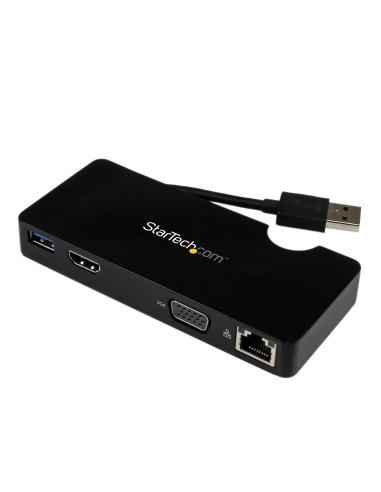 El replicador de puertos de viaje le permite transformar su Ultrabook™ o su ordenador portátil en una estación de trabajo portátil, al agregarle una salida de vídeo HDMI® o VGA, un puerto de concentrador USB 3.0, así como un puerto Ethernet Gigabit RJ45, todo a través de una conexión USB 3.0 anfitrión. El replicador de puertos apto para viaje le ayuda a resolver las limitaciones de puertos de la mayoría de los ordenadores portátiles modernos, lo cual lo convierte en el accesorio ideal para su ordenador portátil, Microsoft Surface™ Pro 4, Surface Pro 3, Surface 3, Surface Pro 2 o Surface Book.