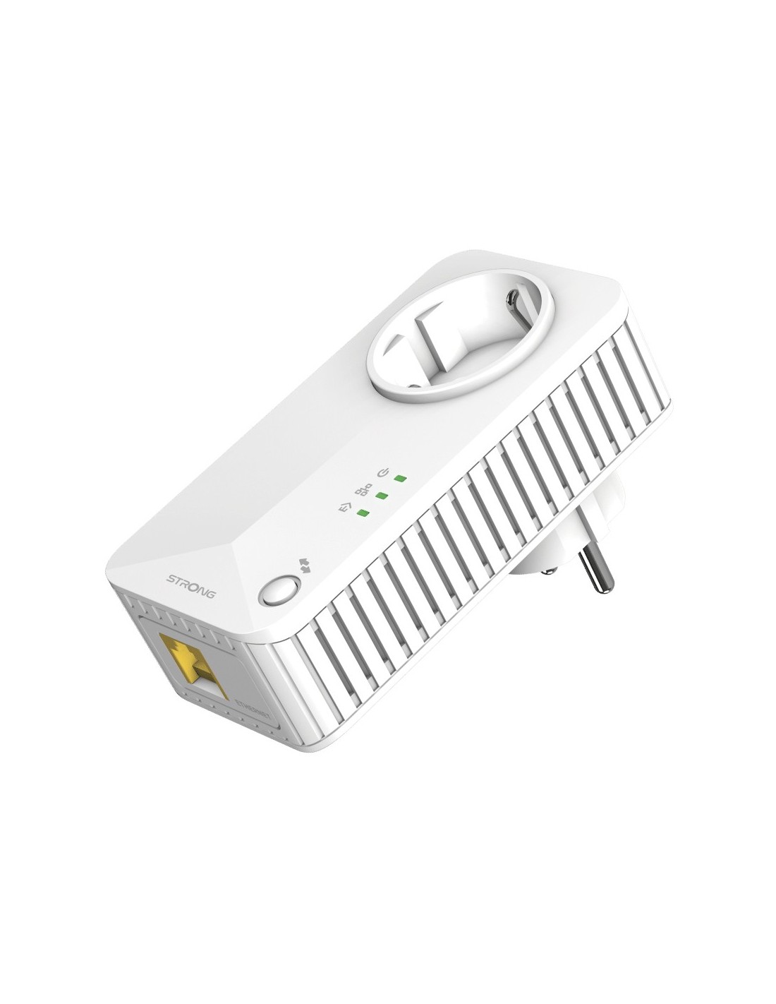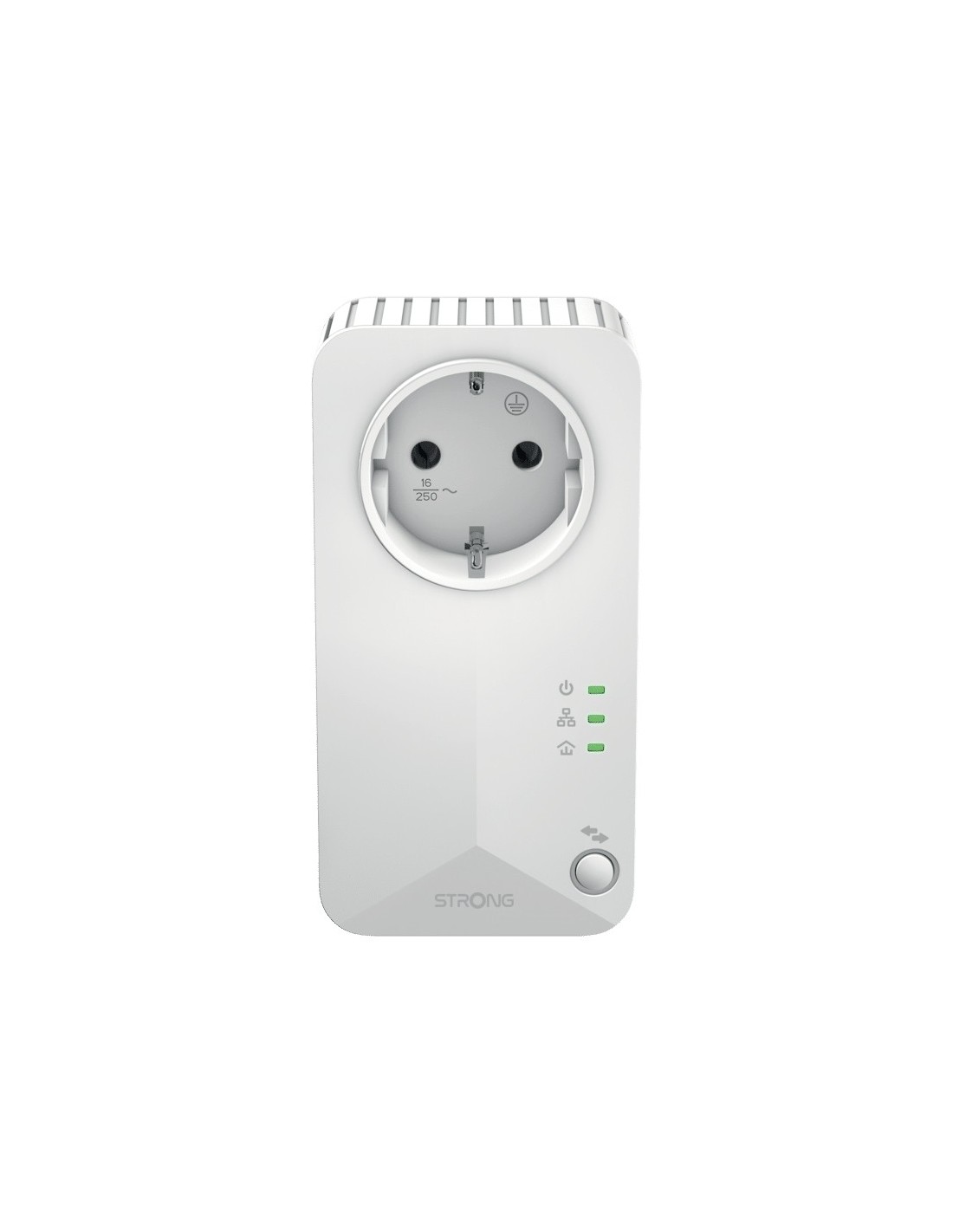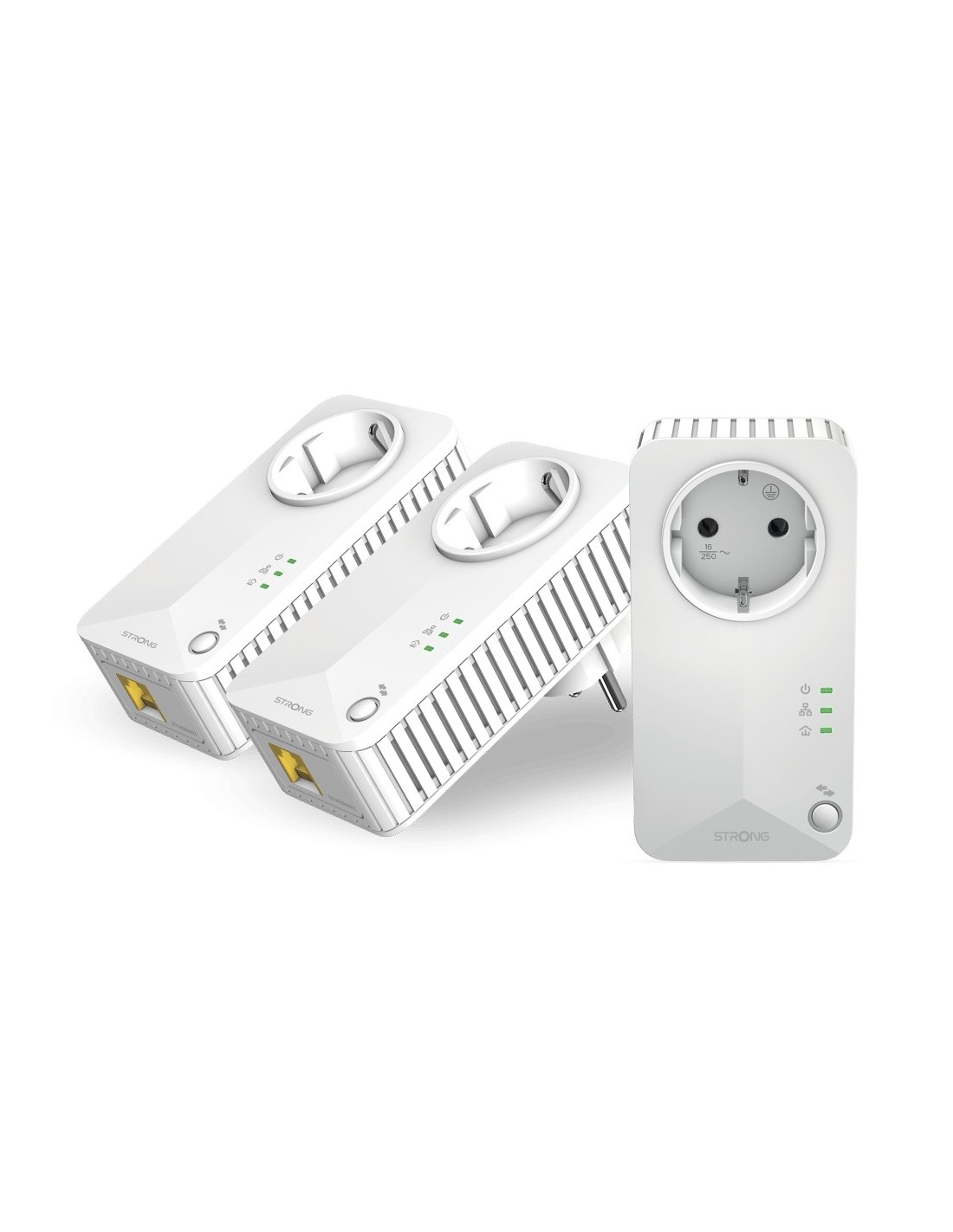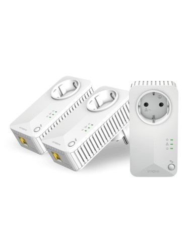 Strong Powerline 600 Triple Pack EU V2. Rango máximo de transferencia de datos: 600 Mbit/s, Estándares de red: IEEE 802.3, IEEE 802.3u, Tipo de interfaz Ethernet LAN: Ethernet rápido. Voltaje de entrada AC: 100 - 240 V, Frecuencia de entrada AC: 50/60 Hz, Corriente: 16 A. Color del producto: Blanco, Tipo de antena: Interno. Sistema operativo Windows soportado: Windows 11, Windows 7, Windows 8, Windows 8.1. Ancho: 60 mm, Profundidad: 74 mm, Altura: 117 mm