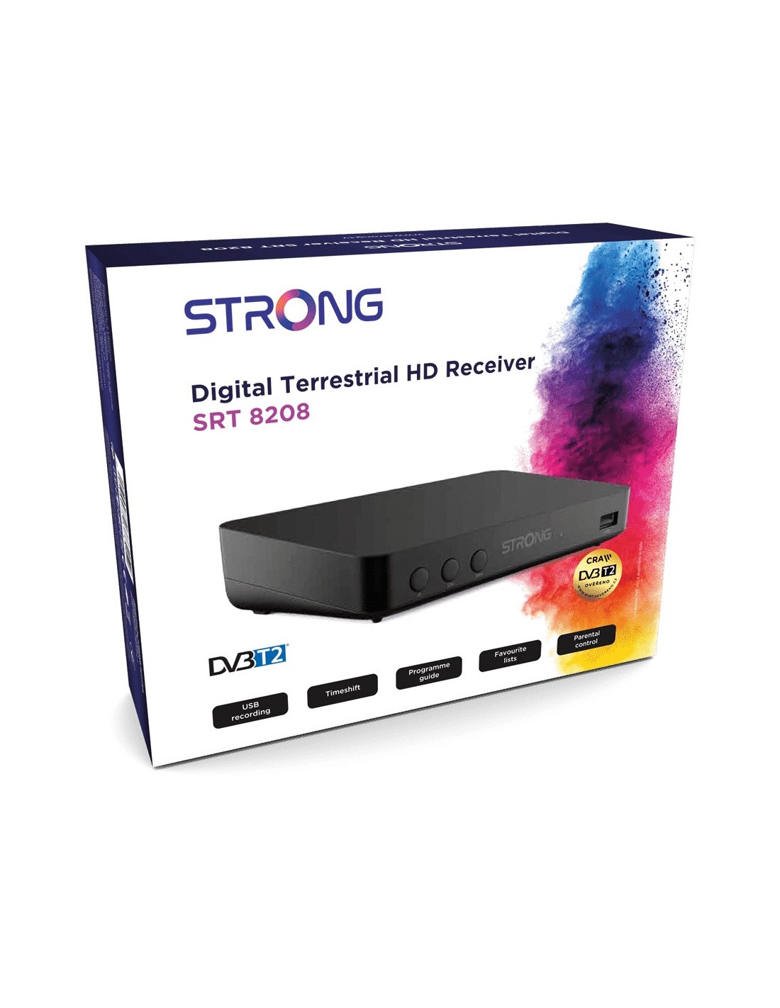Strong SRT 8208. Fuente de señal: Ethernet (RJ-45), Resoluciones de video: 640 x 480,720 x 576,1280 x 720,1920 x 1080, Formato de vídeo soportado: 480i, 480p, 576i, 576p, 720p, 1080i, 1080p. Formatos de vídeo compatibles: H.265, HEVC. Tarjetas de memoria compatibles: SD, Tamaño máximo de tarjeta de memoria: 64 GB. Memoria Flash: 4 MB. Color del producto: Negro, Tipo de sintonizador: Digital, Decodificadores incorporados: Dolby Digital Plus