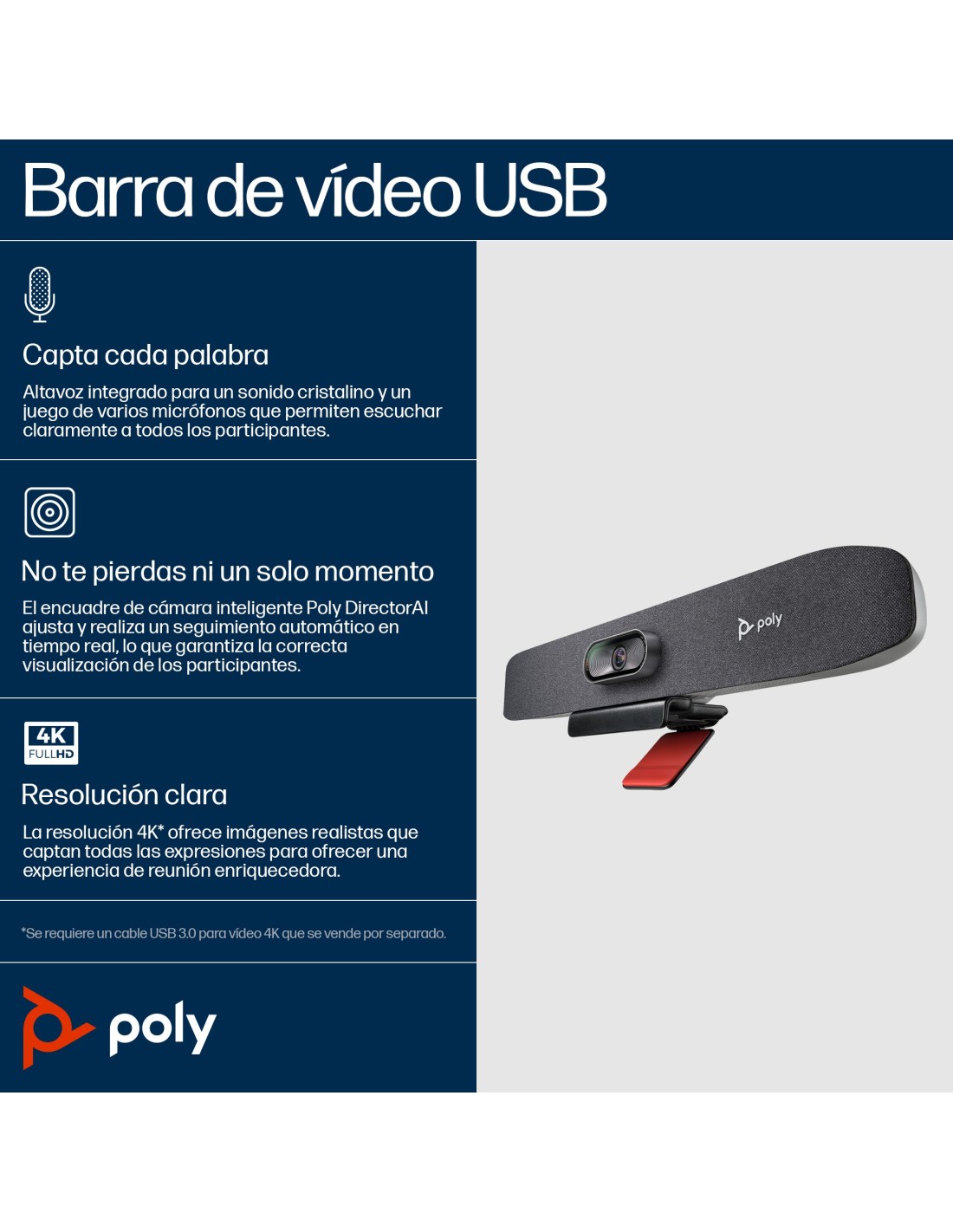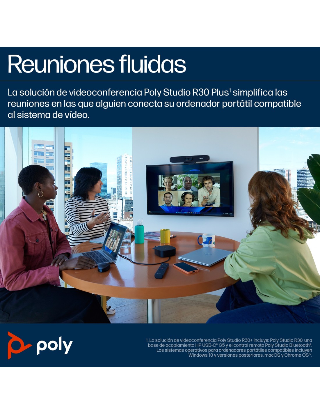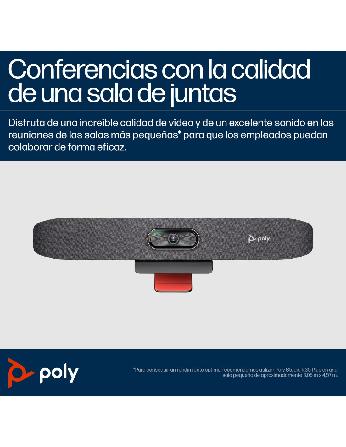 POLY Barra de vídeo Studio USB R30. Tipo HD: 4K Ultra HD, Máxima resolución de video: 3840 x 2160 Pixeles, Formato de vídeo soportado: 720p, 1080p, 2160p. Zoom digital: 5x. Wifi, Bluetooth. Tipo de montaje: Recortar, Color del producto: Gris