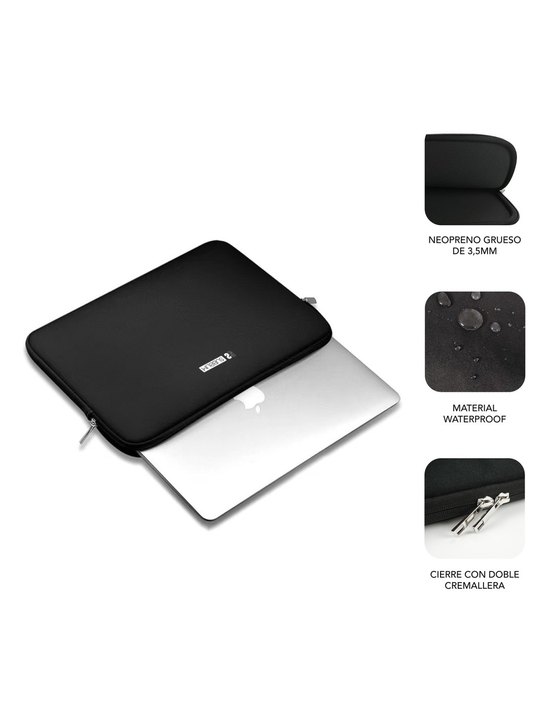 Neopreno Material idóneo para la protección del ordenador con un grosor de 3.5mm que ofrece una mayor seguridad contra los impactos involuntarios. Slim y ligera Diseñada para que ocupe el menor espacio posible sin renunciar a una fuerte protección. Diseño Cierre de doble cremallera que ofrece una mayor facilidad para guardar el ordenador en el interior. Diseño fino que puedes utilizar como cartera para llevar lo imprescindible o meterla en tu mochila para proteger aún más el dispositivo