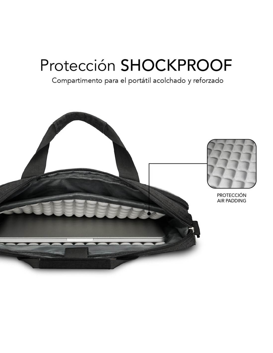 La protección total es una de las principales características del maletín para ordenadores portátiles Subblim Air Padding. En su exclusivo departamento para el ordenador cuenta con un revestimiento de burbujas acolchadas (Air Padding) que proporciona una protección excelente contra golpes o caídas accidentales.