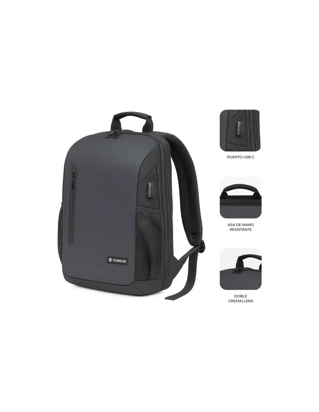 Bolsillo frontal de acceso rápido Panel interior para cargadores, bolígrafos y ratón Bolsillos laterales elásticos para botellas Puerto USB-C externo para cargar tu móvil en movimiento (requiere power bank)