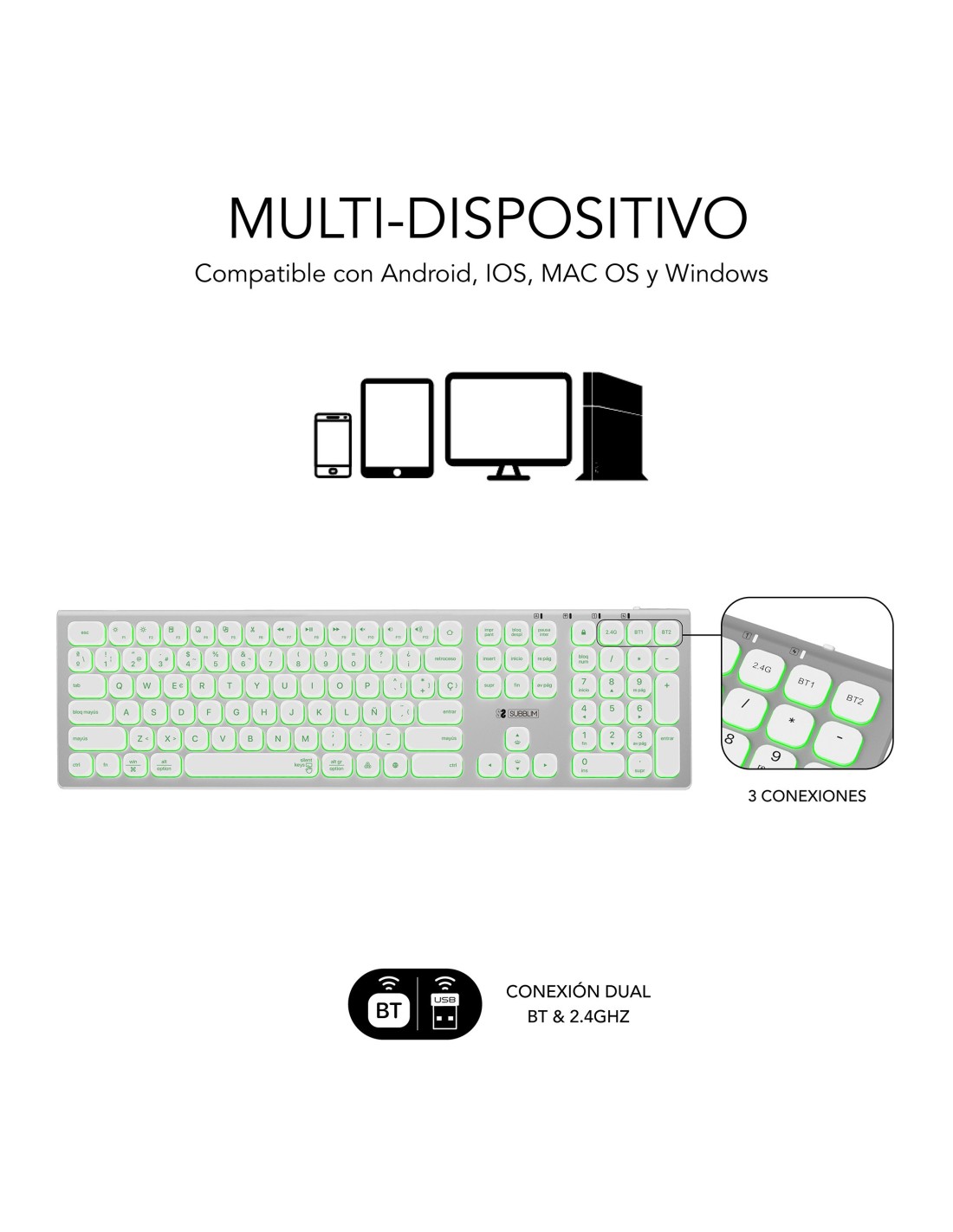 SUBBLIM Teclado Bluetooth/2.4G Master iluminado Ext P/B, Inalámbrico, RF Wireless + Bluetooth, Switch de tecla de tijera, QWERTY, LED RGB, Plata, Blanco