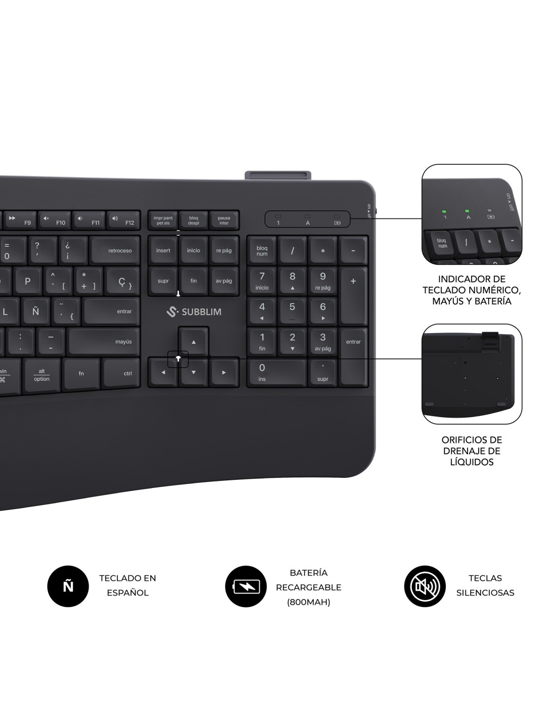 SUBBLIM Teclado con ratón COMBO DUAL OFFICE PROWAVE BLACK. Formato del teclado: Completo (100%). Estilo de teclado: Curvo. Tecnología de conectividad: Inalámbrico, Interfaz del dispositivo: RF Wireless + Bluetooth, Interruptor del teclado: Interruptor de membrana, Diseño de teclado: QWERTY, Teclado, cantidad de teclas: 105. Descansa muñecas. Uso recomendado: Hogar / Oficina. Color del producto: Negro. Ratón incluido