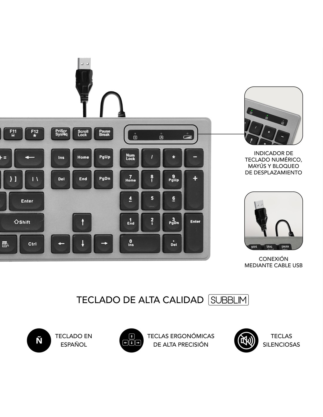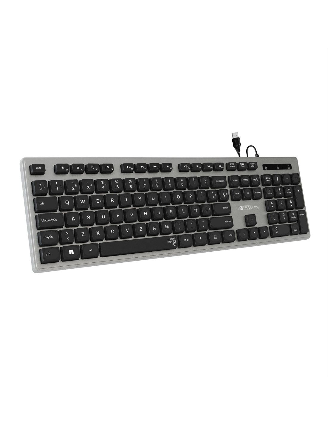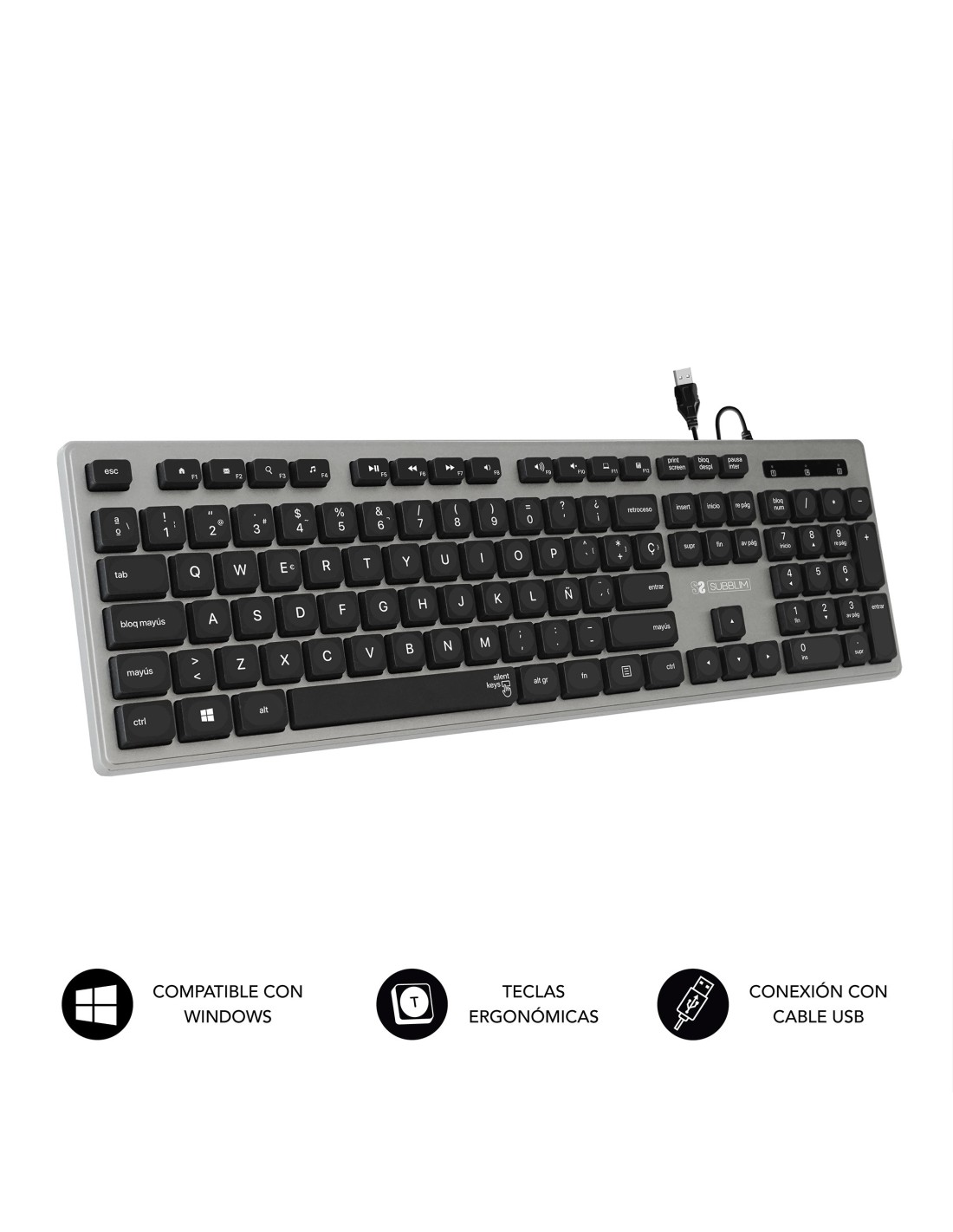 SUBBLIM Teclado Ergonómico con cable USB Plano Silencioso Gris/Negro Ergo