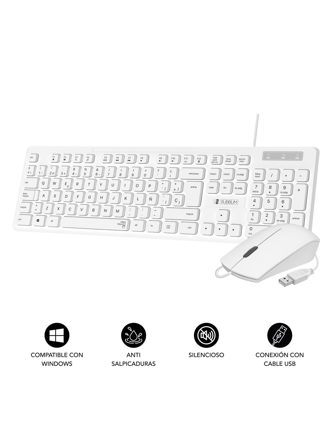 SUBBLIM Teclado Ergonómico y ratón Combo Business Slim Silencioso con cable USB Blanco, Alámbrico, USB, Interruptor de membrana, QWERTY, Blanco, Ratón incluido