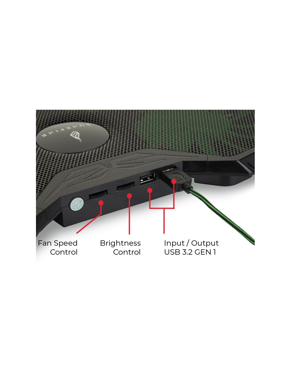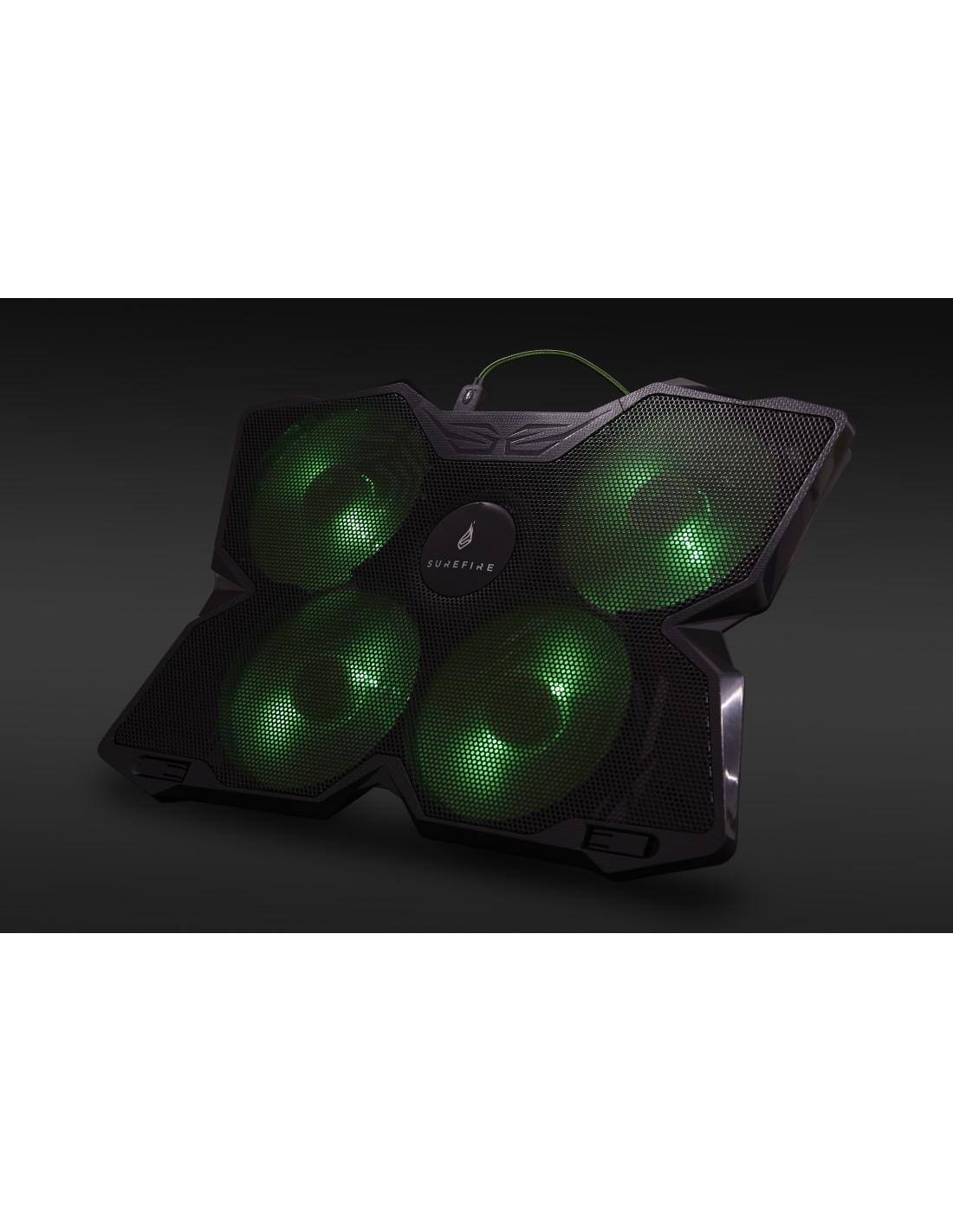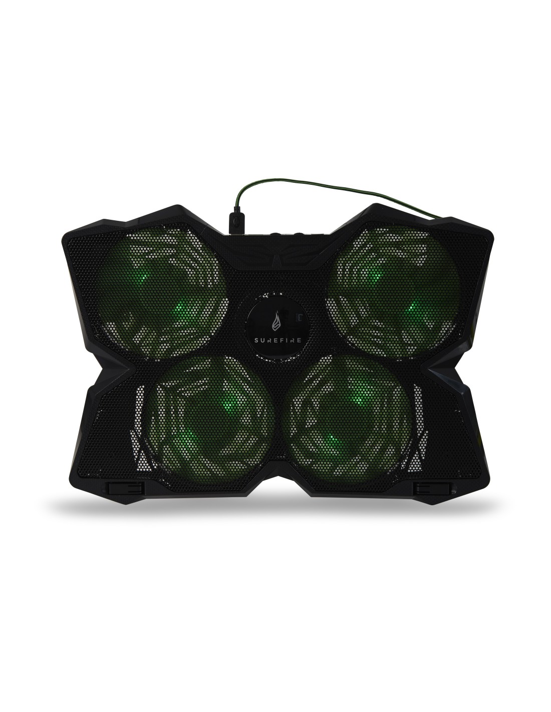 SureFire Bora. Tamaño máximo de pantalla: 43,2 cm (17"), Número de ventiladores incluidos: 4 pieza(s), Diámetro de ventilador: 12 cm. Color del producto: Negro, Material: Metal, Plástico, Iluminación de color: Verde. Interfaz de host: USB, Versión USB: 3.2 Gen 1 (3.1 Gen 1). Alimentación: USB, Voltaje de entrada: 5 V. Longitud de cable: 0,68 m, Ancho: 408 mm, Profundidad: 287 mm