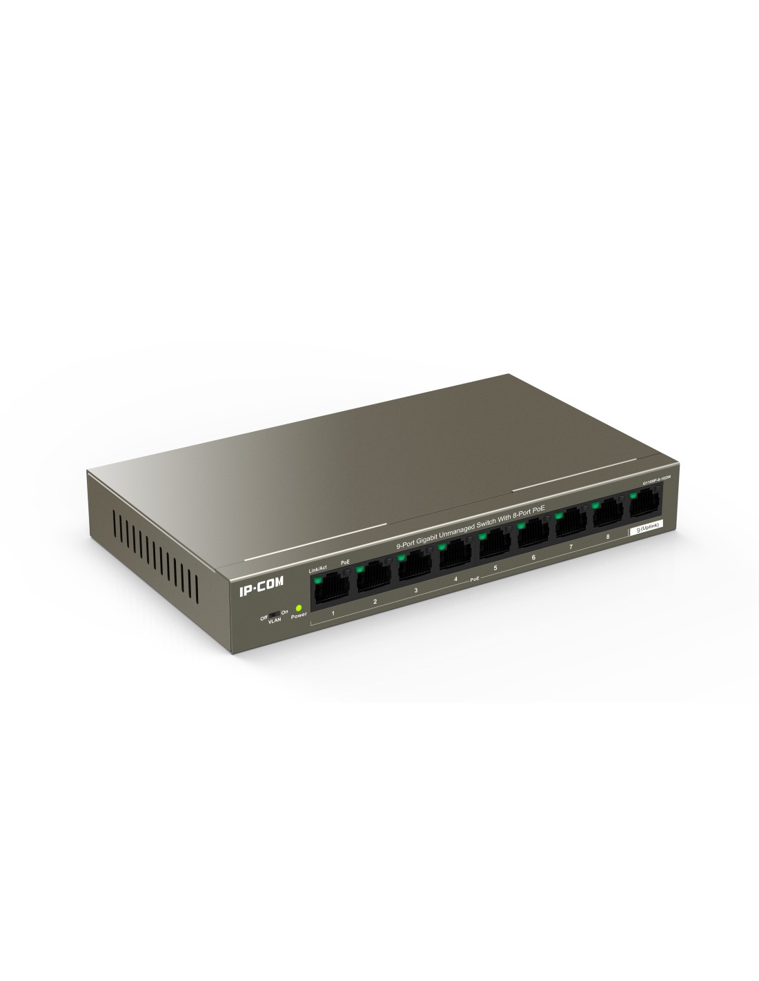 IP-COM Networks G1109P-8-102W. Tipo de interruptor: No administrado. Puertos tipo básico de conmutación RJ-45 Ethernet: Gigabit Ethernet (10/100/1000), Cantidad de puertos básicos de conmutación RJ-45 Ethernet: 9. Tabla de direcciones MAC: 16000 entradas, Capacidad de conmutación: 18 Gbit/s. Estándares de red: IEEE 802.3, IEEE 802.3ab, IEEE 802.3af, IEEE 802.3at, IEEE 802.3u, IEEE 802.3x. Energía sobre Ethernet (PoE)