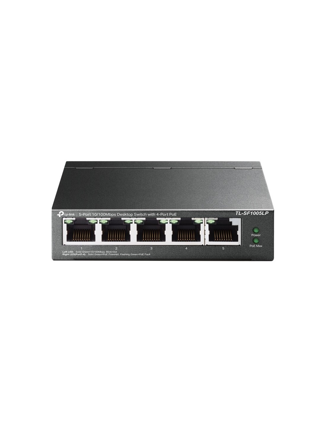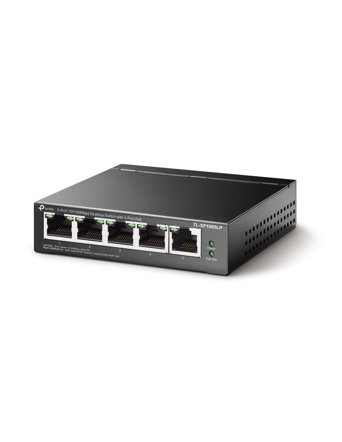 TP-Link TL-SF1005LP. Tipo de interruptor: No administrado. Puertos tipo básico de conmutación RJ-45 Ethernet: Fast Ethernet (10/100), Cantidad de puertos básicos de conmutación RJ-45 Ethernet: 5. Bidireccional completo (Full duplex). Tabla de direcciones MAC: 2000 entradas, Capacidad de conmutación: 1 Gbit/s. Estándares de red: IEEE 802.3af, IEEE 802.3i, IEEE 802.3u, IEEE 802.3x. Energía sobre Ethernet (PoE)