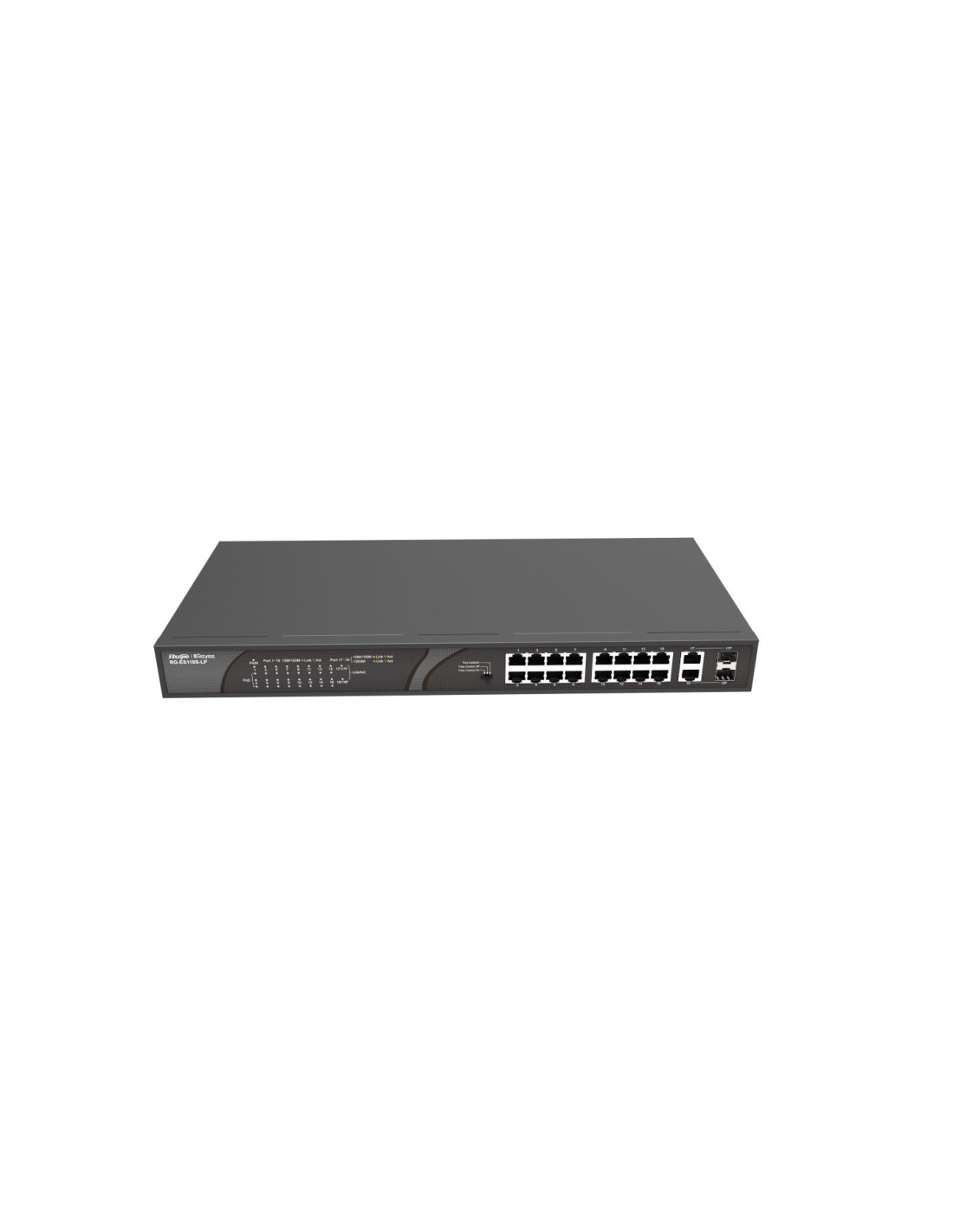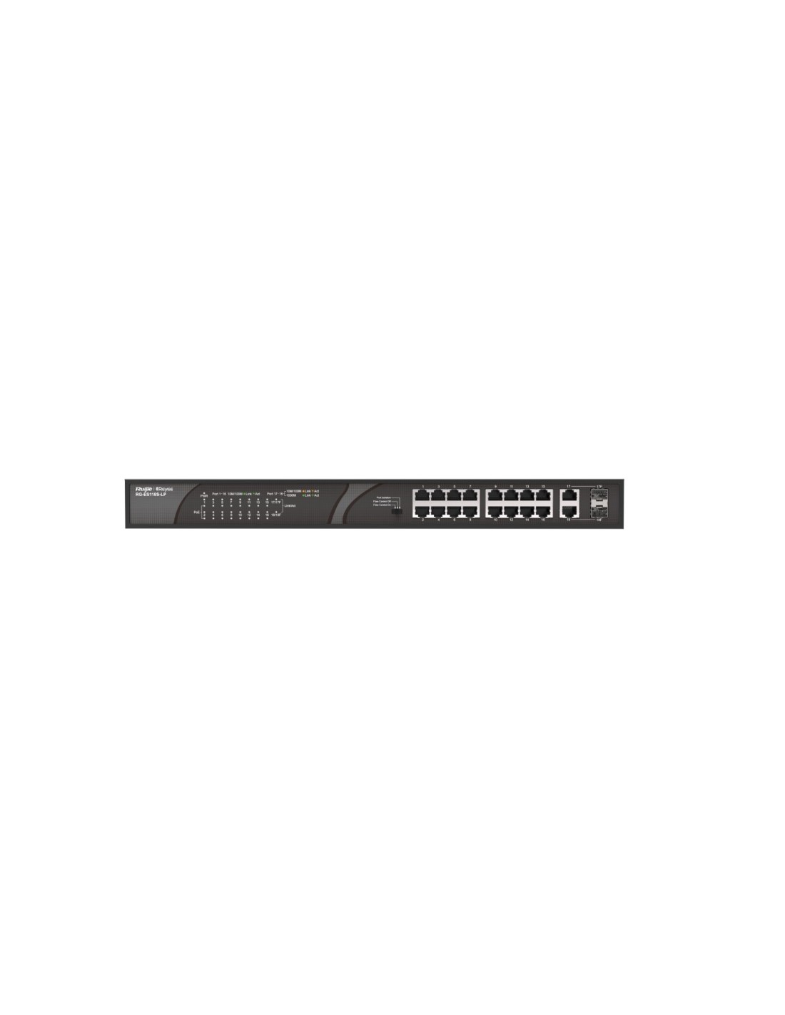 Ruijie Networks RG-ES118S-LP. Tipo de interruptor: No administrado. Puertos tipo básico de conmutación RJ-45 Ethernet: Fast Ethernet (10/100), Cantidad de puertos básicos de conmutación RJ-45 Ethernet: 18. Tabla de direcciones MAC: 8000 entradas, Capacidad de conmutación: 7,2 Gbit/s. Energía sobre Ethernet (PoE). Montaje en rack