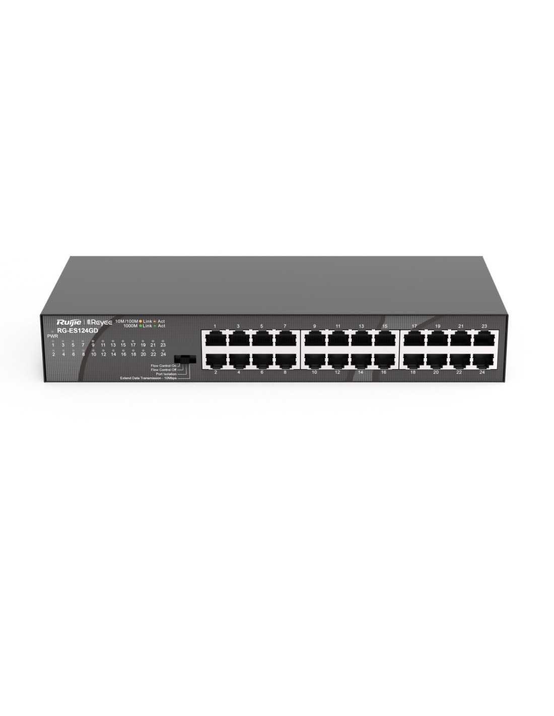 Ruijie Networks RG-ES124GD. Tipo de interruptor: No administrado. Puertos tipo básico de conmutación RJ-45 Ethernet: Gigabit Ethernet (10/100/1000), Cantidad de puertos básicos de conmutación RJ-45 Ethernet: 24. Tabla de direcciones MAC: 8000 entradas, Capacidad de conmutación: 48 Gbit/s