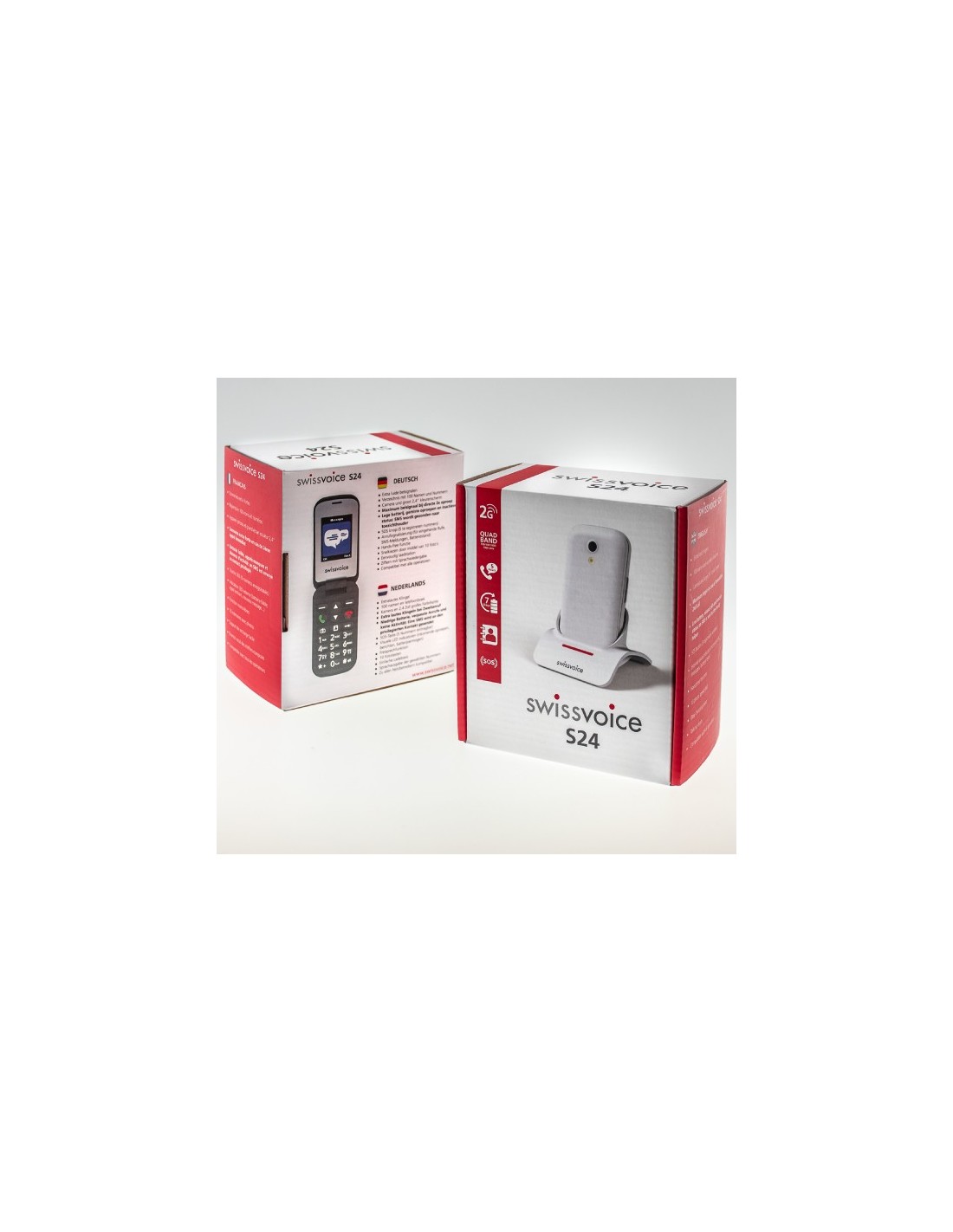 S24 el teléfono plegable fácil de usar para más serenidad. S24 está equipado con una pantalla color de 2,4 pulgadas y con un indicador luminoso externo para visualizar las llamadas entrantes, el nivel de batería y la llegada de nuevos mensajes. Referente al sonido, el S24 dispone de timbres fuertes para que no se pierda ninguna llamada. 3 funciones exclusivas de Swissvoice : el timbre más fuerte en caso de segunda llamada inmediata de la misma persona, el envío de un SMS a los contactos elegidos previamente en caso de batería baja o de varias llamadas pérdidas y el envío de un SMS a los contactos elegidos en caso de ausencia de actividad del móvil. Y para una mayor seguridad, la tecla SOS permite avisar por SMS y por llamadas vocales hasta 5 personas.