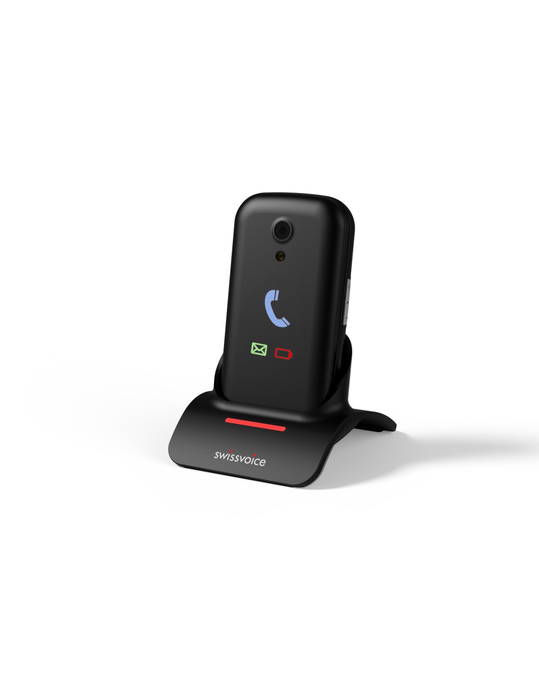 SwissVoice S28. Factor de forma: Móvil con tapa. Capacidad de la tarjeta SIM: SIM única. Diagonal de la pantalla: 7,11 cm (2.8"), Resolución de la pantalla: 240 x 320 Pixeles. Resolución de la cámara trasera (numérica): 2 MP. Bluetooth. Tecnología de batería: Ión de litio, Capacidad de batería: 800 mAh, Tiempo de suspendido (2G): 168 h. Color del producto: Negro