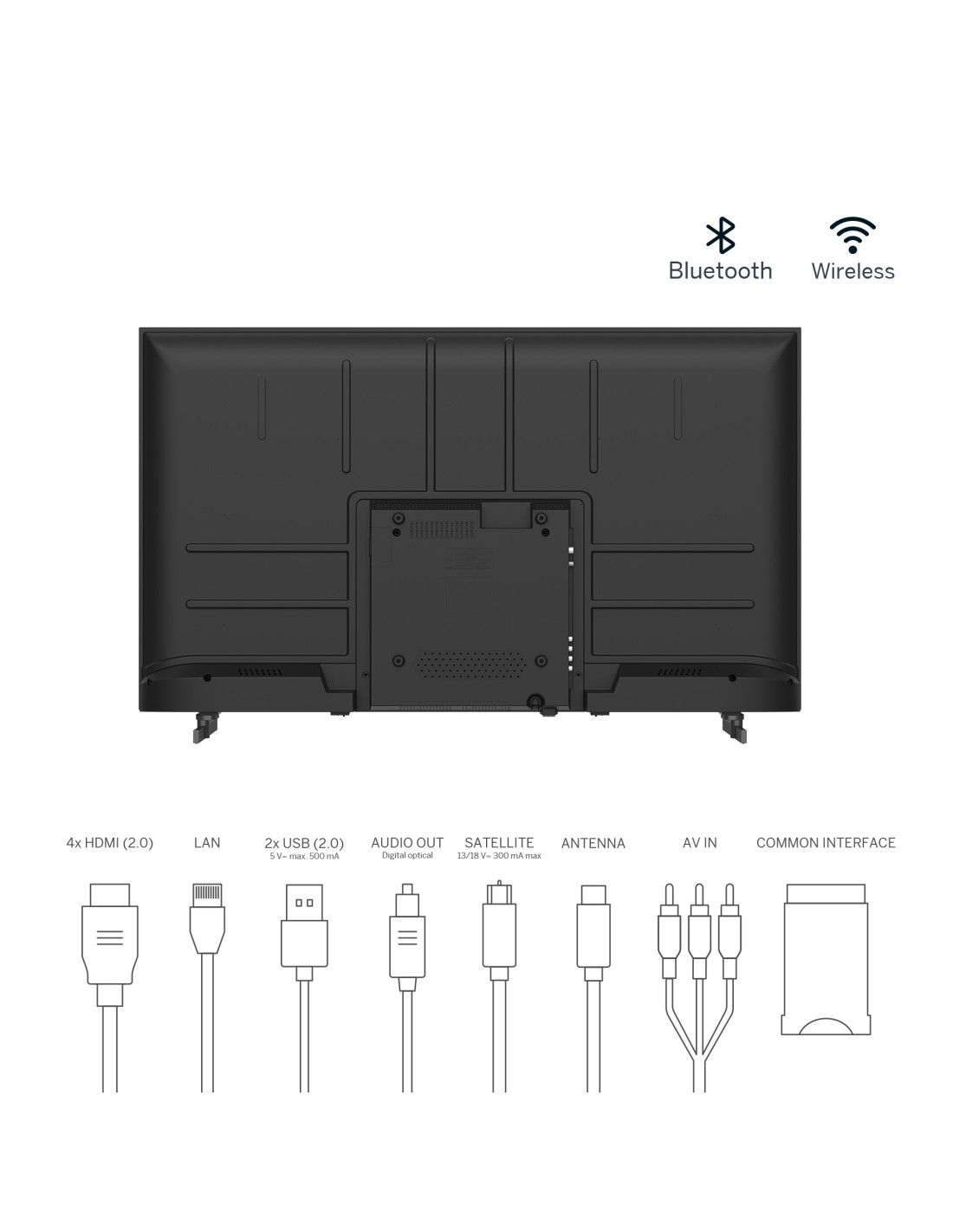 Thomson 43QA2S13. Diagonal de la pantalla: 109,2 cm (43"), Resolución de la pantalla: 3840 x 2160 Pixeles, Tipo HD: 4K Ultra HD, Tecnología de visualización: QLED, Forma de la pantalla: Plana, Tipo de retroiluminación LED: Direct-LED. Smart TV. Relación de aspecto nativa: 16:9. Formato de señal digital: DVB-C, DVB-S, DVB-S2, DVB-T, DVB-T2. Wifi, Ethernet. Color del producto: Gris