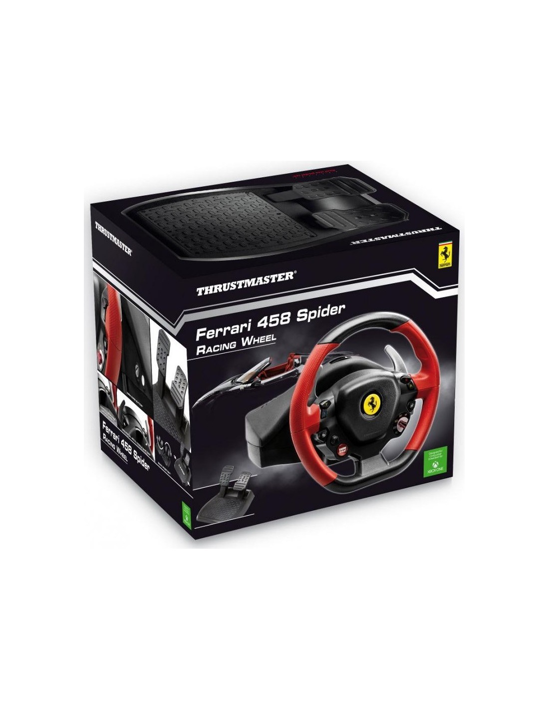 Thrustmaster Ferrari 458 Spider. Tipo de dispositivo: Volante + Pedales, Plataformas de juego soportadas: Xbox One, Botones de función control para gaming: Cruceta. Tecnología de conectividad: Alámbrico. Color del producto: Negro, Rojo. Ancho: 370 mm, Profundidad: 320 mm, Altura: 3,15 mm. Ancho del paquete: 320 mm, Profundidad del paquete: 370 mm, Altura del paquete: 320 mm