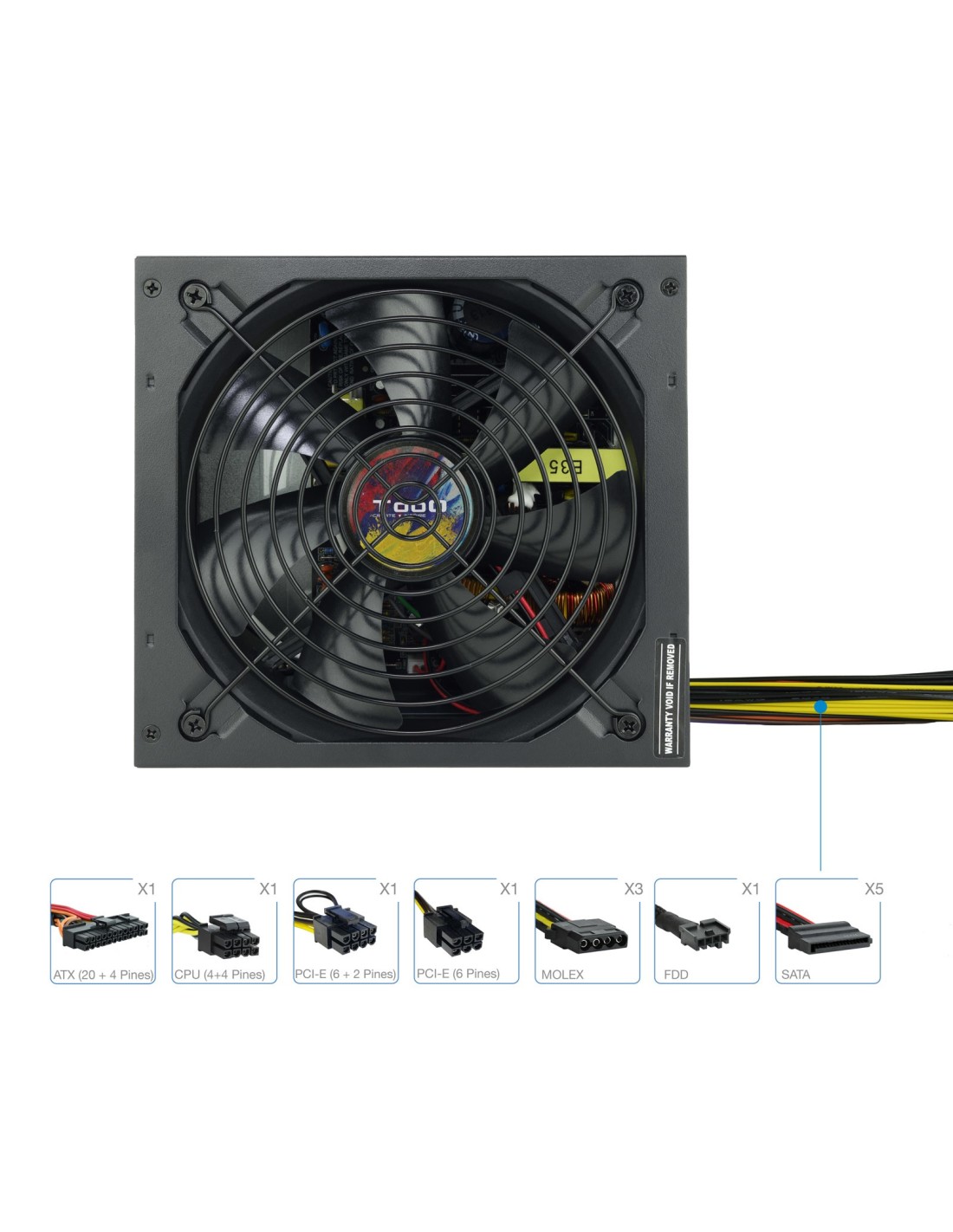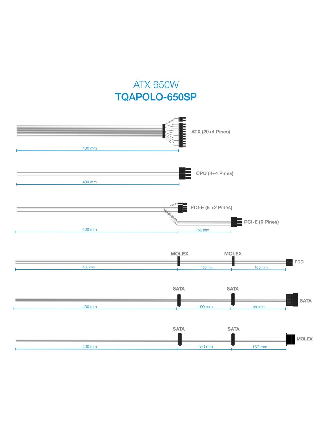 TooQ TQAPOLO-650SP. Potencia total: 650 W, Voltaje de entrada AC: 220 V, Frecuencia de entrada AC: 50 - 60 Hz. Alimentador de energía para tarjeta madre: 20+4 pin ATX, Longitud del cable de alimentación de la placa base: 40 cm, Longitud del cable de alimentación SATA: 400,550,700 mm. Utilizar con: PC, Factor de forma de fuente de alimentación (PSU): ATX, Formas de factor de tarjeta madre soportadas: ATX. Color del producto: Negro, Tipo de enfriamiento: Activo, Diámetro de ventilador: 14 cm. Cables incluidos: Corriente alterna