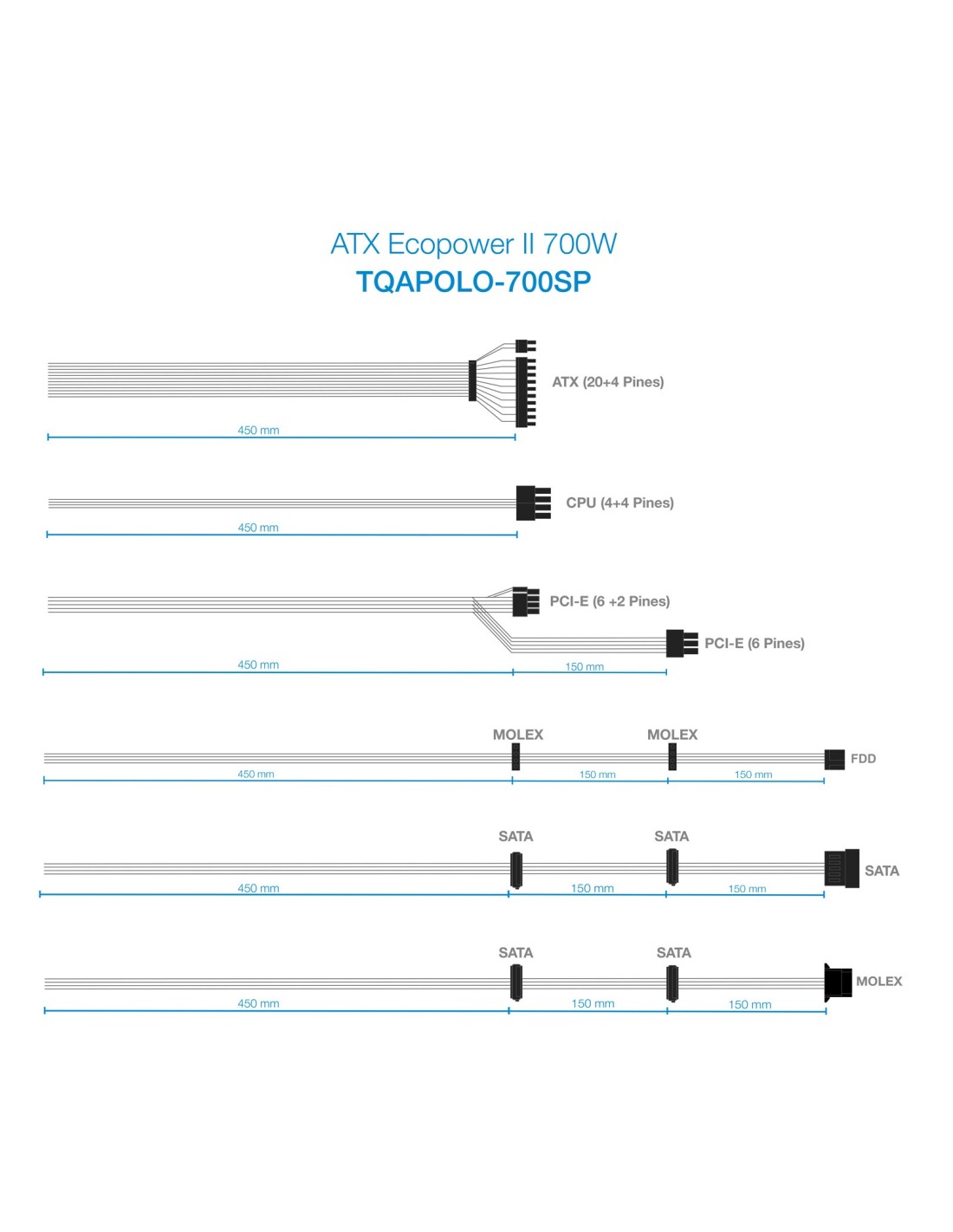 TooQ TQAPOLO-700SP. Potencia total: 700 W, Voltaje de entrada AC: 220 V, Frecuencia de entrada AC: 50 - 60 Hz. Alimentador de energía para tarjeta madre: 20+4 pin ATX, Longitud del cable de alimentación de la placa base: 45 cm, Longitud del cable de alimentación SATA: 700 mm. Utilizar con: PC, Factor de forma de fuente de alimentación (PSU): ATX, Formas de factor de tarjeta madre soportadas: ATX. Color del producto: Negro, Tipo de enfriamiento: Activo, Diámetro de ventilador: 14 cm. Cables incluidos: Corriente alterna