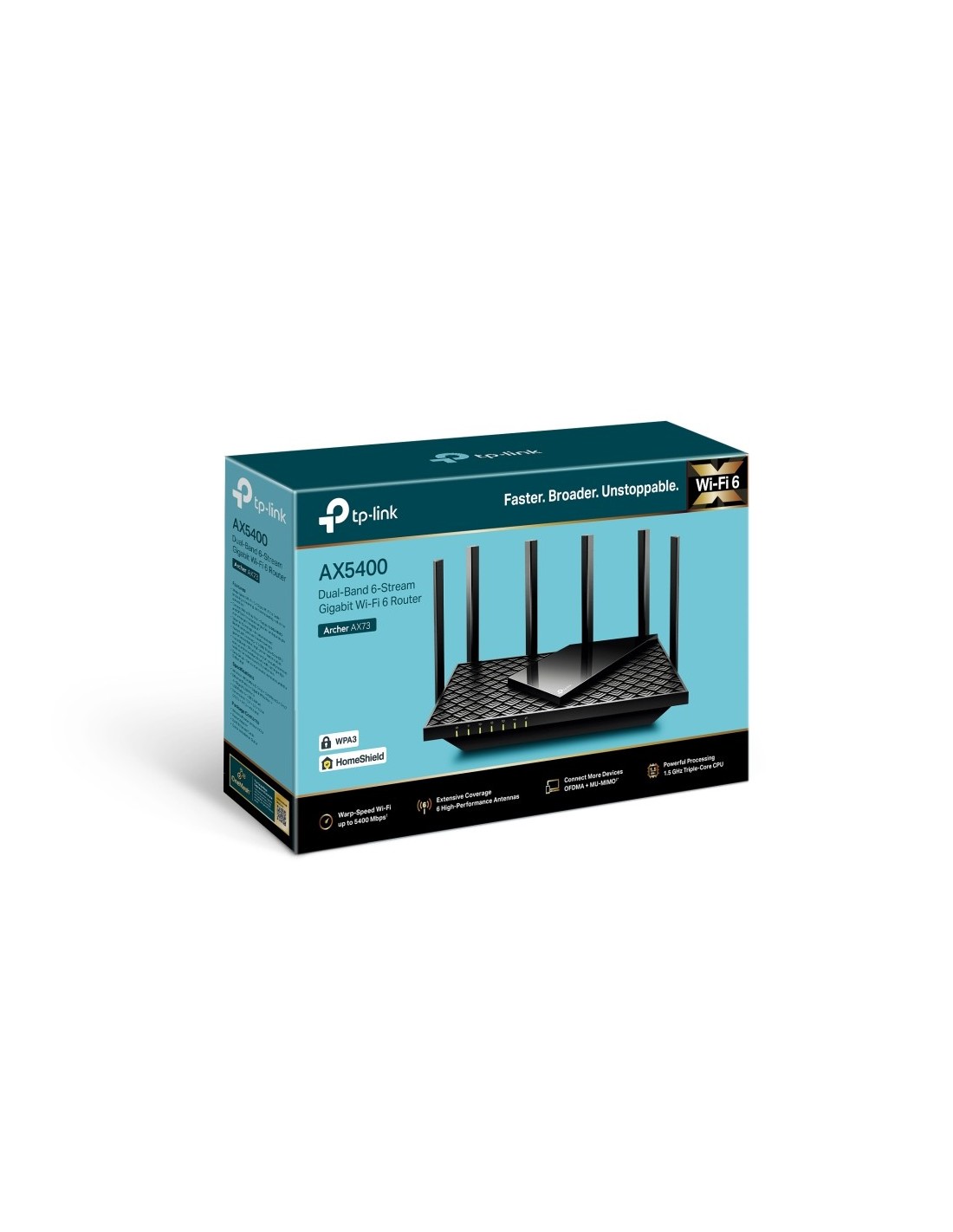TP-Link Archer AX73. Tipo de conexión WAN: RJ-45. Banda Wi-Fi: Doble banda (2,4 GHz / 5 GHz), Estándar Wi-Fi: Wi-Fi 6 (802.11ax), Tasa de transferencia de datos WLAN (máx.): 5400 Mbit/s. Tipo de interfaz Ethernet LAN: Gigabit Ethernet, Ethernet LAN, velocidad de transferencia de datos: 10,100,1000 Mbit/s, Tecnología de cableado: 10/100/1000Base-T(X). Algoritmos de seguridad soportados: WPA, WPA-Enterprise, WPA2, WPA2-Enterprise, WPA3. Protocolos de red compatibles: IPv4, IPv6