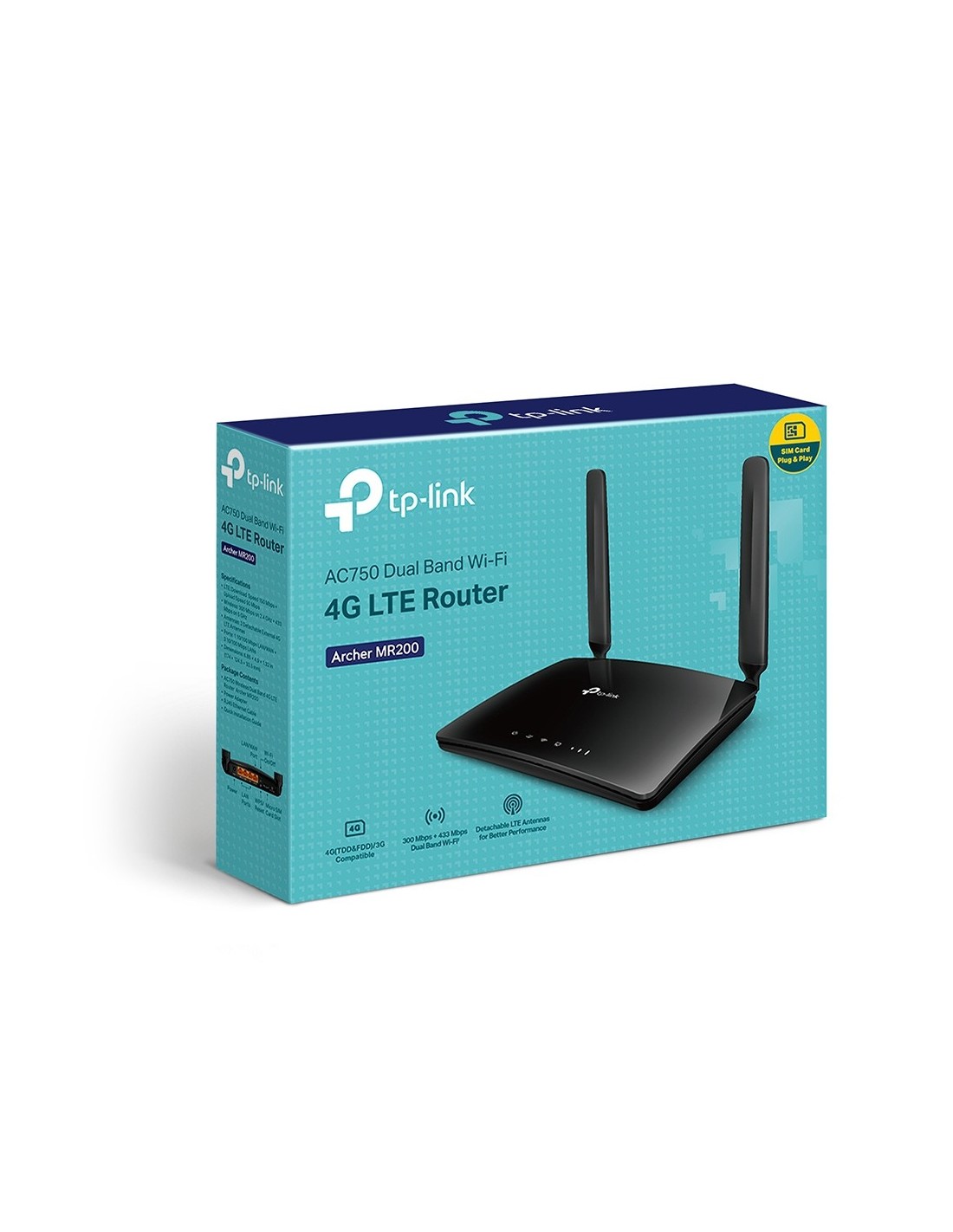 TP-Link Archer MR200. Banda Wi-Fi: Doble banda (2,4 GHz / 5 GHz), Estándar Wi-Fi: Wi-Fi 5 (802.11ac), Tasa de transferencia de datos WLAN (máx.): 433 Mbit/s. Tipo de interfaz Ethernet LAN: Ethernet rápido, Ethernet LAN, velocidad de transferencia de datos: 10,100 Mbit/s, Tecnología de cableado: 10/100Base-T(X). Generación de red móvil: 4G, Estándares 2G: Edge, GPRS, GSM, Estándares 3G: DC-HSPA+, HSPA, HSPA+, UMTS. Algoritmos de seguridad soportados: 64-bit WEP, 128-bit WEP, WPA, WPA-PSK, WPA2, WPA2-PSK, Seguridad con cortafuegos: DoS, SPI Firewall, IP and MAC Address Binding. Protocolo de trasmisión de datos: IPv4, IPv6