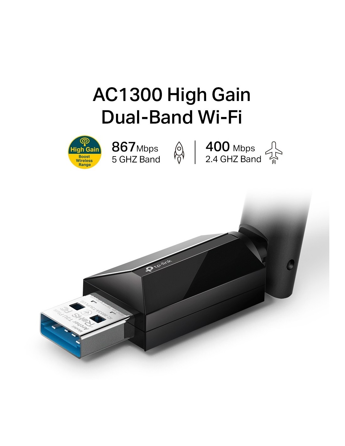 TP-Link Archer T3U Plus. Tecnología de conectividad: Inalámbrico, Interfaz de host: USB, Interfaz: WLAN. Rango máximo de transferencia de datos: 867 Mbit/s, Estándar Wi-Fi: Wi-Fi 5 (802.11ac), Banda Wi-Fi: Doble banda (2,4 GHz / 5 GHz). USB con suministro de corriente. Color del producto: Negro