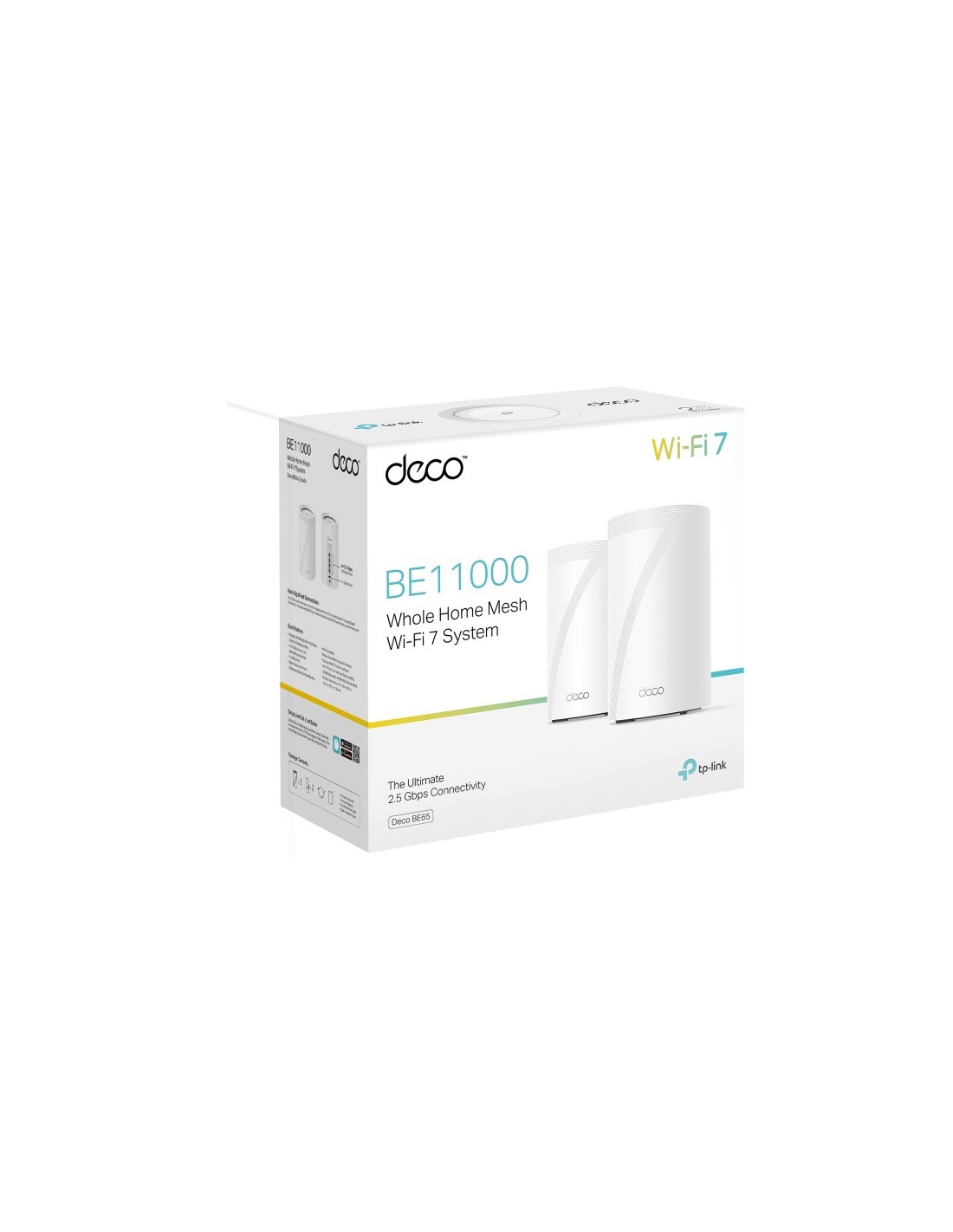TP-Link Deco BE65. Color del producto: Blanco, Tipo de antena: Interno, Tipo de producto: Sistema de malla. Banda Wi-Fi: Tribanda (2.4 GHz / 5 GHz / 6 GHz), Estándar Wi-Fi: Wi-Fi 7 (802.11be), Tasa de transferencia de datos WLAN (máx.): 11000 Mbit/s. Asistente virtual: Amazon Alexa & Google Assistant, Compatible con servicios en la nube: TP-Link ID, Prestaciones de control parental: Hora de dormir, Perfiles personalizados, Family online time ranking, Tiempo en familia, Off time,.... Certificación: CE, FCC, RoHS. Ancho: 107,5 mm, Profundidad: 107,5 mm, Altura: 176 mm