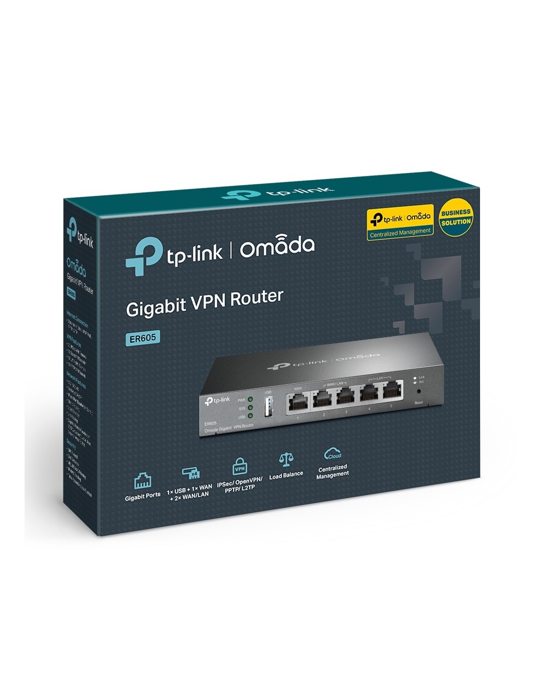 TP-Link Omada ER605. Estándares de red: IEEE 802.1Q, IEEE 802.3, IEEE 802.3ab, IEEE 802.3u, IEEE 802.3x, Tipo de interfaz ethernet: Gigabit Ethernet, Tecnología de cableado: 10/100/1000Base-T(X). Protocolo de routing: RIP-1, RIP-2, Protocolos de gestión: Telnet, Protocolos de red compatibles: TCP/IP, DHCP, ICMP, NAT, PPPoE, SNTP, HTTP, DNS, IPsec, PPTP, L2TP. Algoritmos de seguridad soportados: 3DES, 128-bit AES, 192-bit AES, 256-bit AES, DES, MD5, SHA-1, Método de autenticación: SHA-1, MD5, Soporte VPN: • 20 IPsec VPN Tunnels • LAN-to-LAN, Client-to-LAN • Main, Aggressive Negotiation Mode •.... Certificados de conformidad: RoHS. Cables incluidos: Corriente alterna