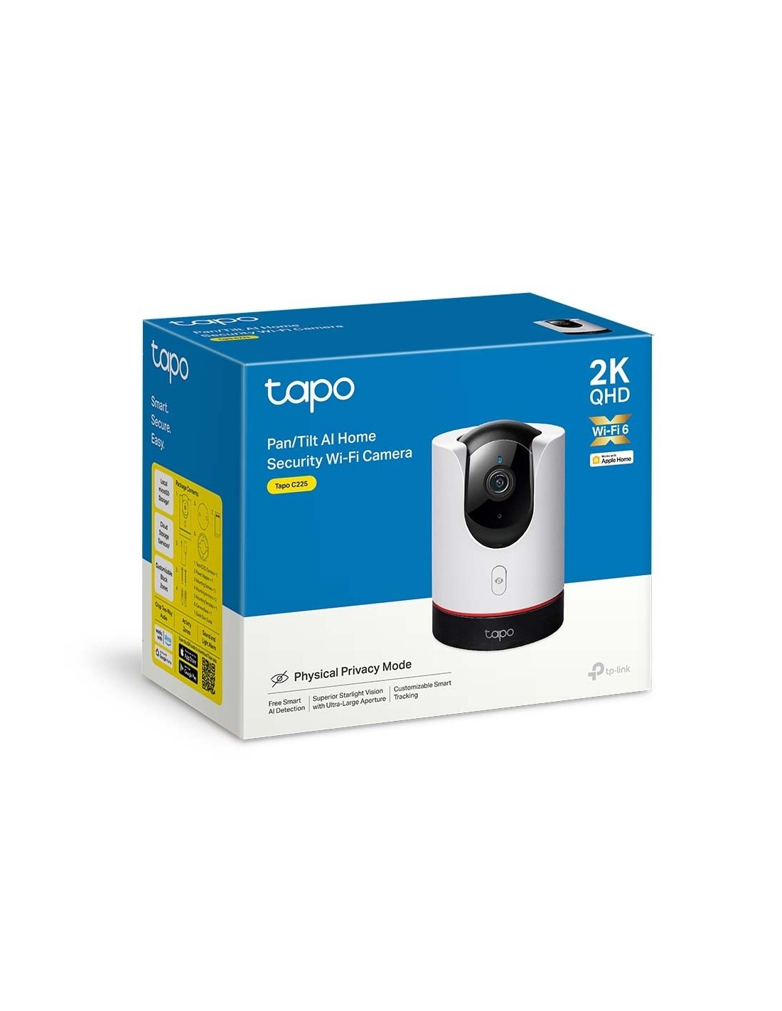 TP-Link Tapo C225. Tipo: Cámara de seguridad IP, Colocación soportada: Interior, Tecnología de conectividad: Inalámbrico. Tipo de montaje: Escritorio, Color del producto: Negro, Blanco, Factor de forma: Torre. Ángulo de campo de visión (FOV): 360°, Ángulo de rotación: 360°, Ángulo de inclinación: 0 - 149°. Tipo de sensor: Starlight, Tamaño del sensor óptico: 25,4 / 3 mm (1 / 3"), Resolución efectiva del sensor: 1440 Pixeles. Distancia focal fija: 4 mm