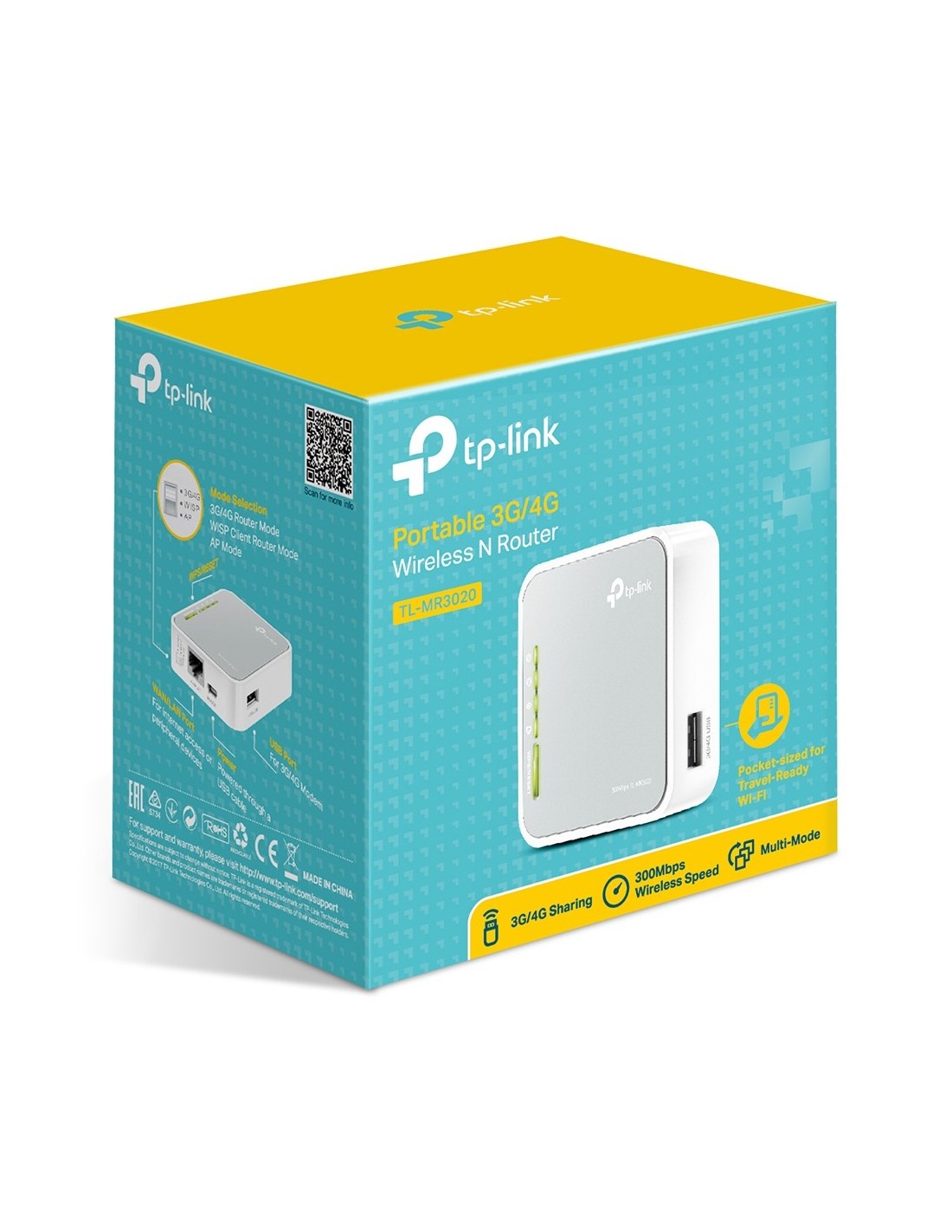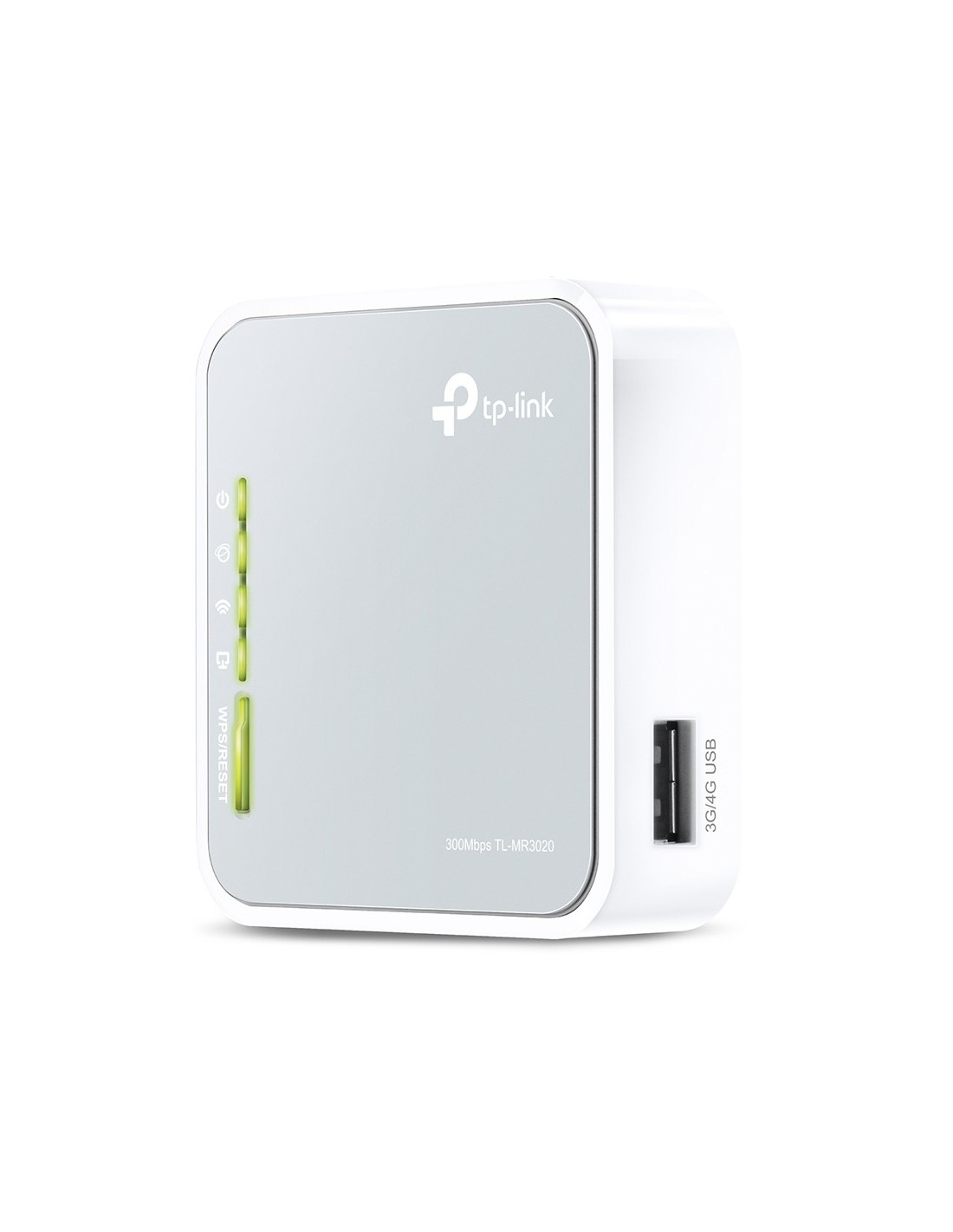 TP-Link TL-MR3020. Tipo de conexión WAN: RJ-45. Banda Wi-Fi: Banda única (2,4 GHz), Estándar Wi-Fi: Wi-Fi 4 (802.11n), Tasa de transferencia de datos WLAN (máx.): 300 Mbit/s. Tipo de interfaz Ethernet LAN: Ethernet rápido, Ethernet LAN, velocidad de transferencia de datos: 10,100 Mbit/s, Estándares de red: IEEE 802.11b, IEEE 802.11g, IEEE 802.11n. Generación de red móvil: 4G, Estándares 3G: EVDO, HSPA, HSPA+, UMTS, Estándar 4G: LTE. Algoritmos de seguridad soportados: 64-bit WEP, 128-bit WEP, WPA-PSK, WPA2-PSK, Seguridad con cortafuegos: DoS, SPI