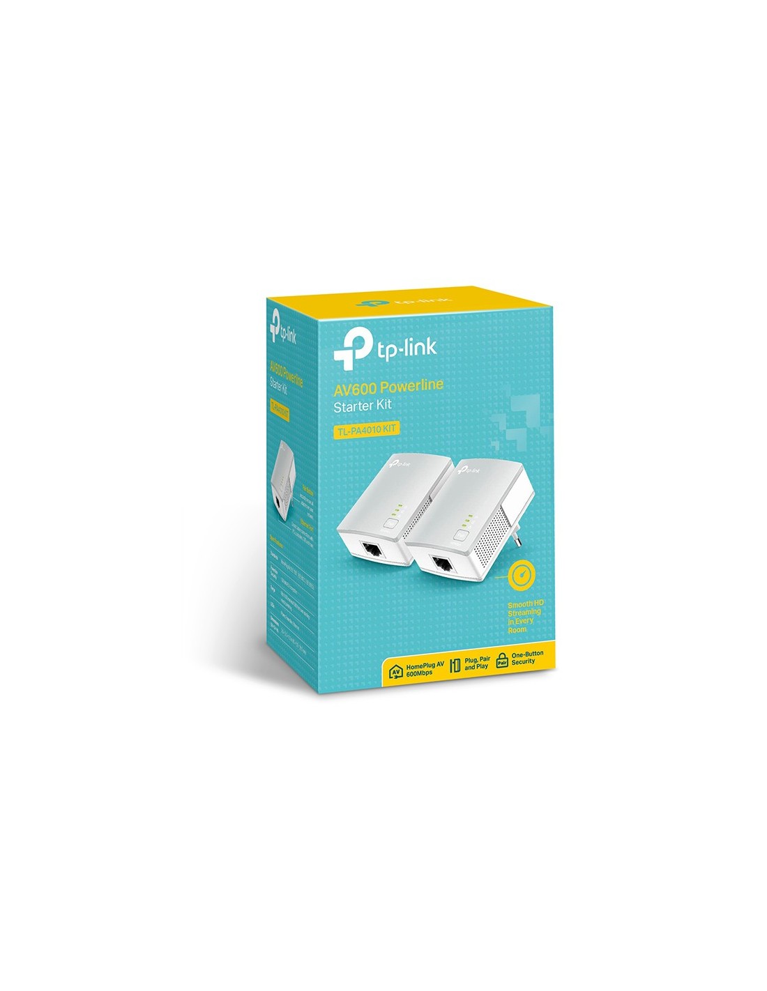TP-Link TL-PA4010KIT. Rango máximo de transferencia de datos: 600 Mbit/s, Estándares de red: IEEE 802.3, IEEE 802.3u, Tipo de interfaz Ethernet LAN: Ethernet rápido. Consumo energético: 4,26 W, Consumo de energía (inactivo): 0,88 W. Color del producto: Blanco, Certificación: CE, FCC. Ancho: 65 mm, Profundidad: 52 mm, Altura: 28,5 mm. Certificados de conformidad: RoHS
