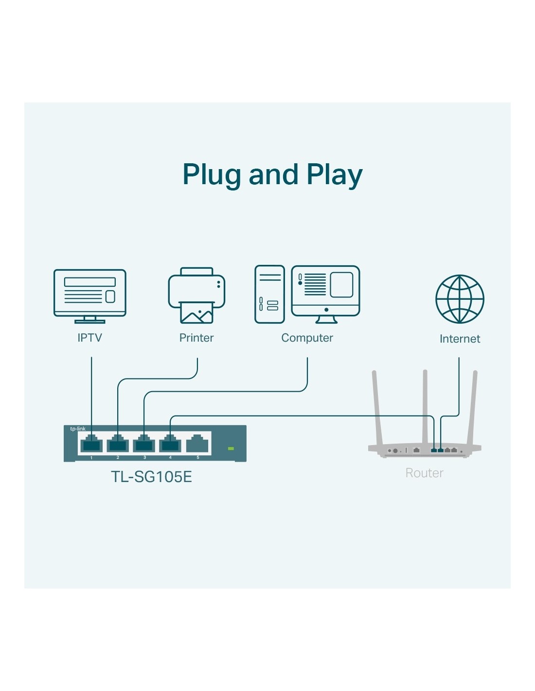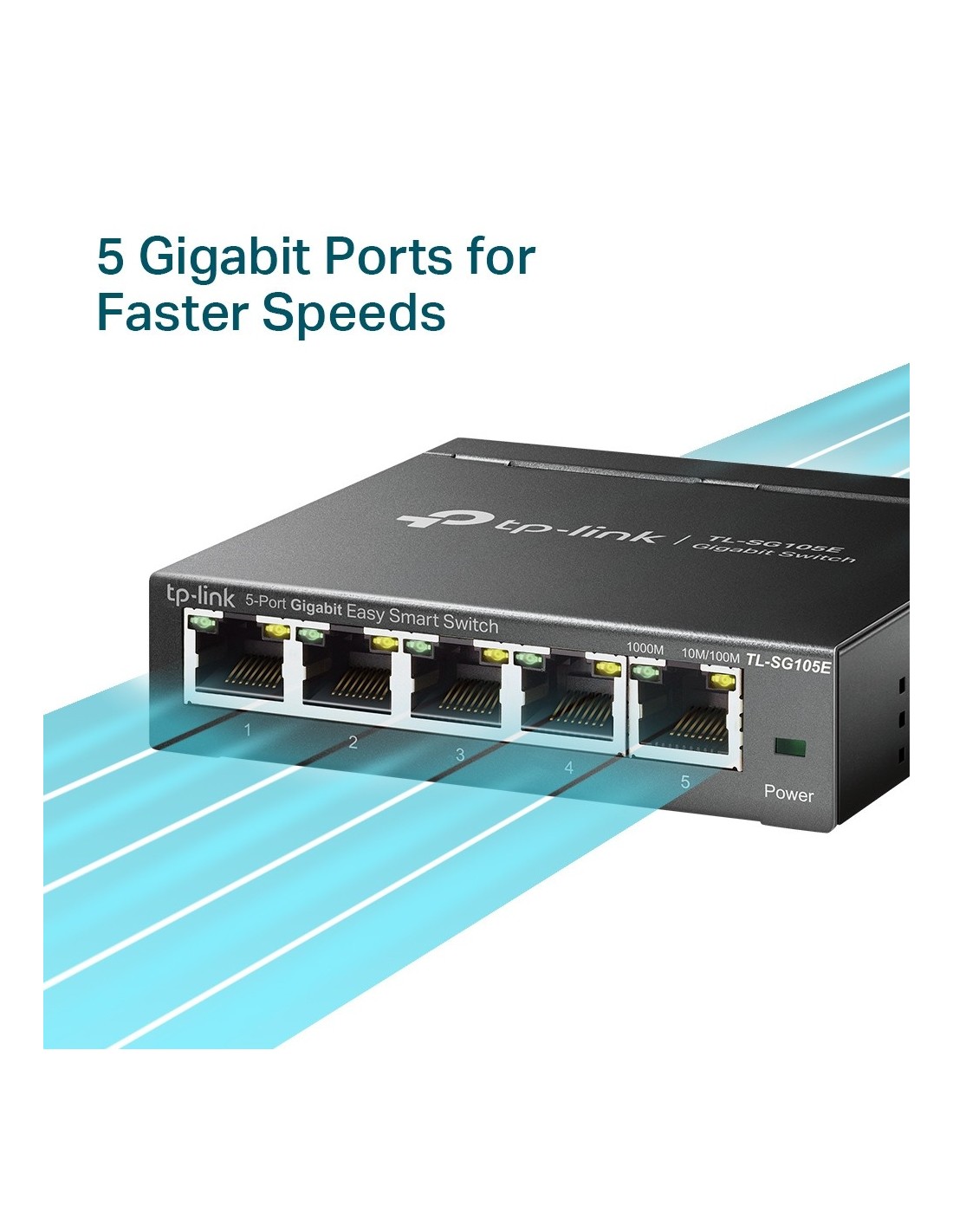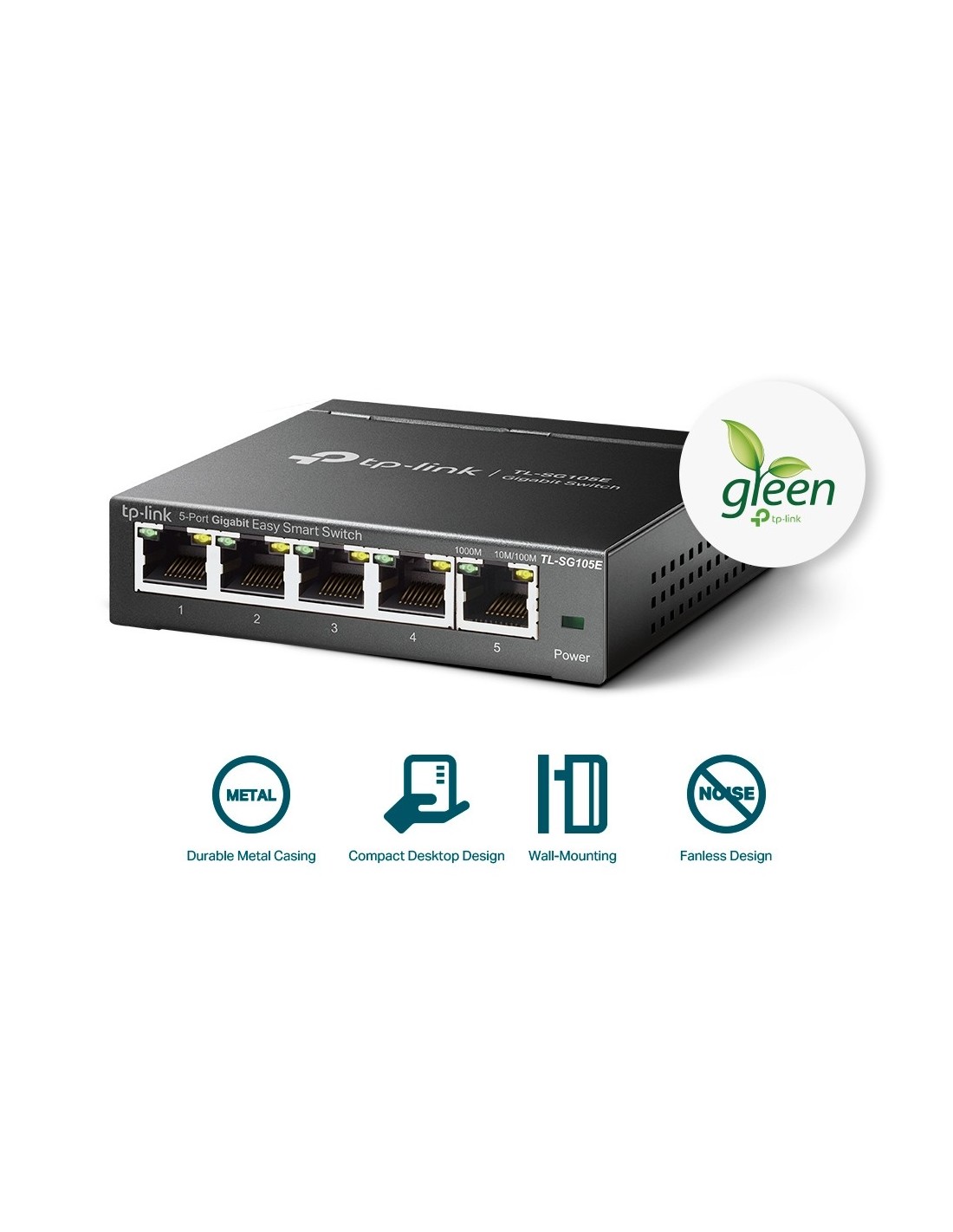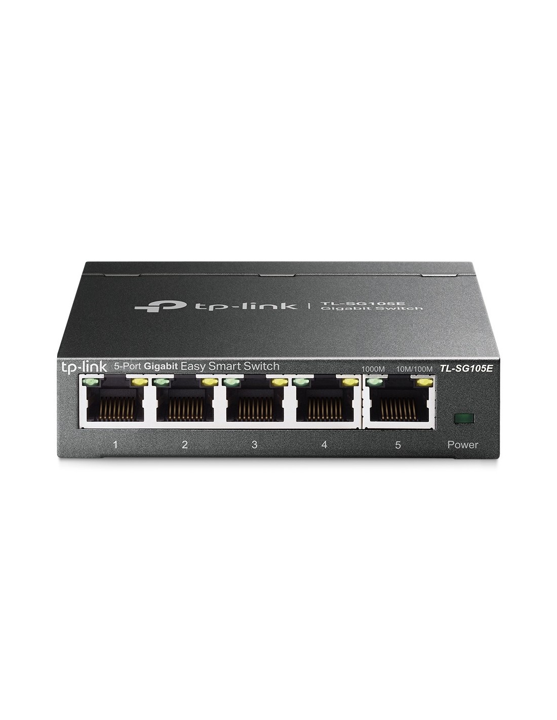 TP-Link TL-SG105E. Tipo de interruptor: Gestionado, Capa del interruptor: L2. Puertos tipo básico de conmutación RJ-45 Ethernet: Gigabit Ethernet (10/100/1000), Cantidad de puertos básicos de conmutación RJ-45 Ethernet: 5. Tabla de direcciones MAC: 8192 entradas. Estándares de red: IEEE 802.1Q, IEEE 802.1p, IEEE 802.3, IEEE 802.3ab, IEEE 802.3u, IEEE 802.3x. Voltaje de entrada DC: 5 V