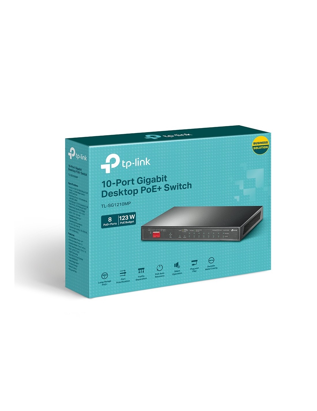 TP-Link TL-SG1210MP. Tipo de interruptor: No administrado. Puertos tipo básico de conmutación RJ-45 Ethernet: Gigabit Ethernet (10/100/1000), Cantidad de puertos básicos de conmutación RJ-45 Ethernet: 9. Tabla de direcciones MAC: 4000 entradas, Capacidad de conmutación: 20 Gbit/s. Estándares de red: IEEE 802.3af, IEEE 802.3at, IEEE 802.3i, IEEE 802.3u, IEEE 802.3x, IEEE 802.3z. Energía sobre Ethernet (PoE)