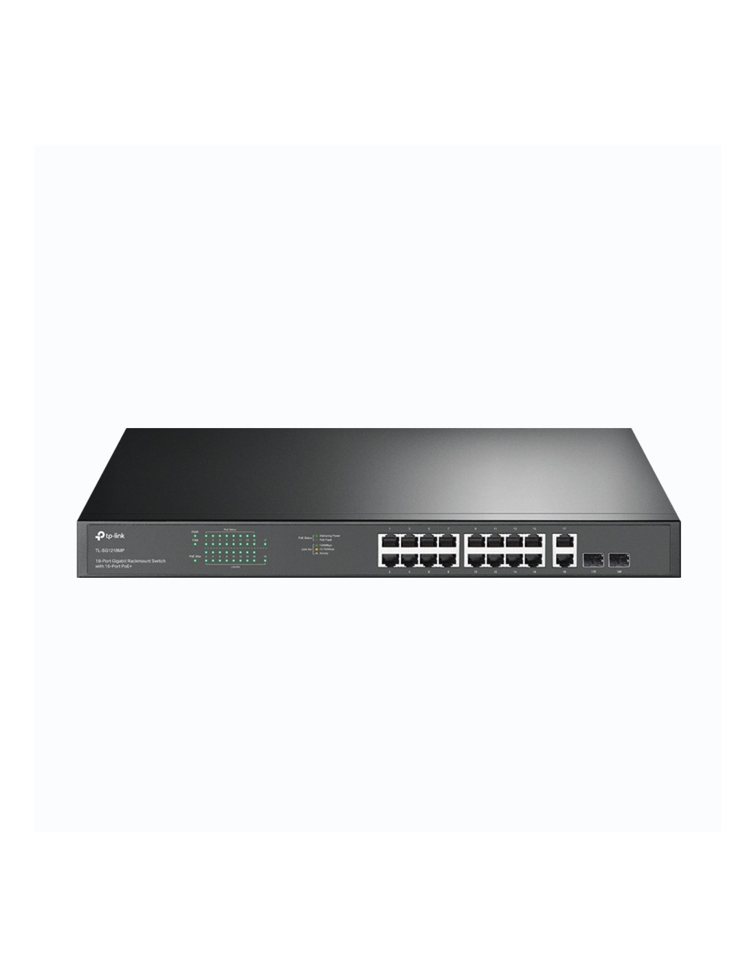 TP-Link TL-SG1218MP. Tipo de interruptor: No administrado. Puertos tipo básico de conmutación RJ-45 Ethernet: Gigabit Ethernet (10/100/1000), Cantidad de puertos básicos de conmutación RJ-45 Ethernet: 18. Bidireccional completo (Full duplex). Tabla de direcciones MAC: 8000 entradas, Capacidad de conmutación: 36 Gbit/s. Estándares de red: IEEE 802.1Q, IEEE 802.1p, IEEE 802.3, IEEE 802.3ab, IEEE 802.3u, IEEE 802.3x. Energía sobre Ethernet (PoE). Montaje en rack, Factor de forma: 1U