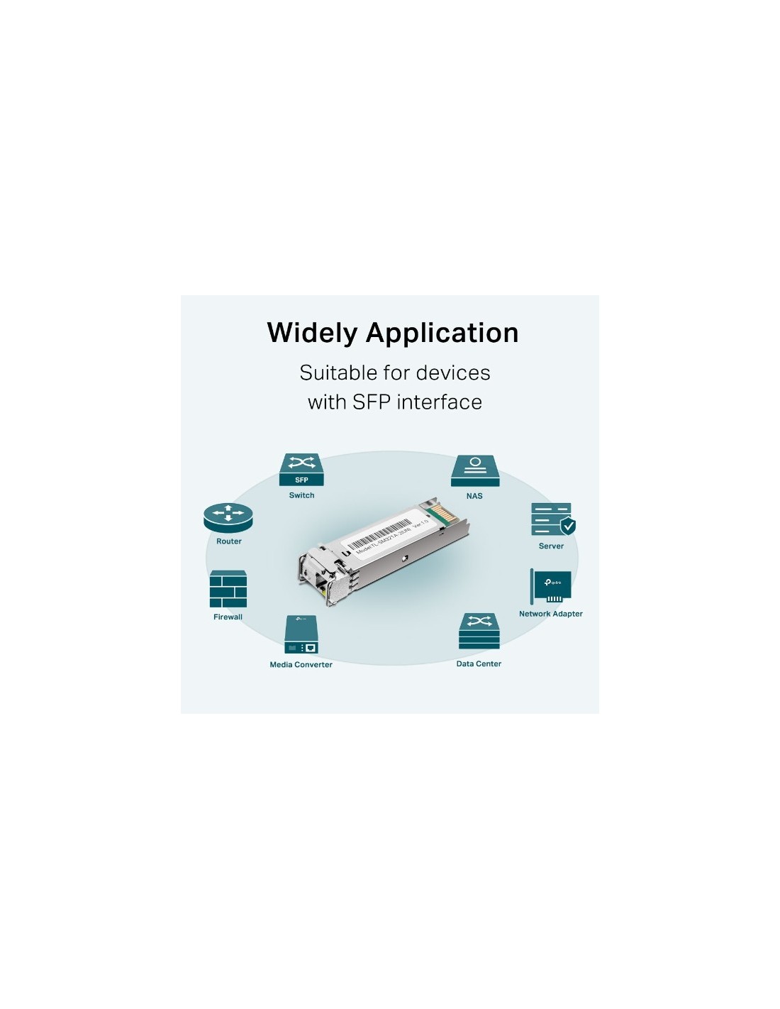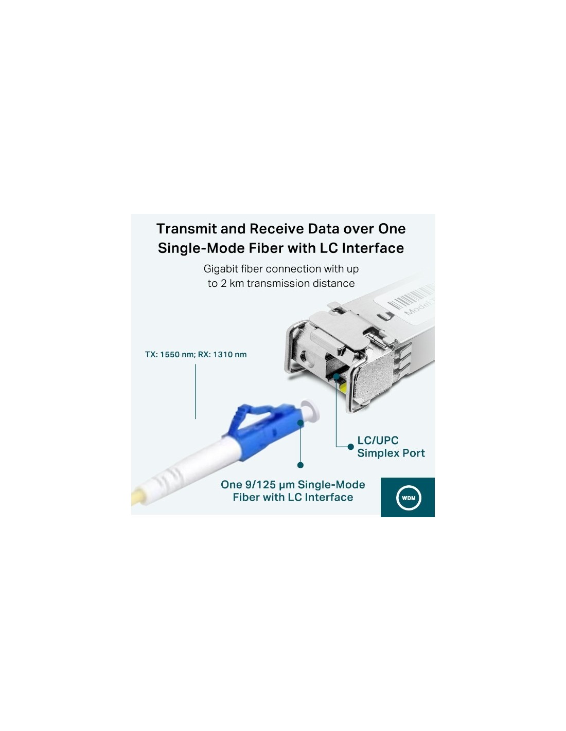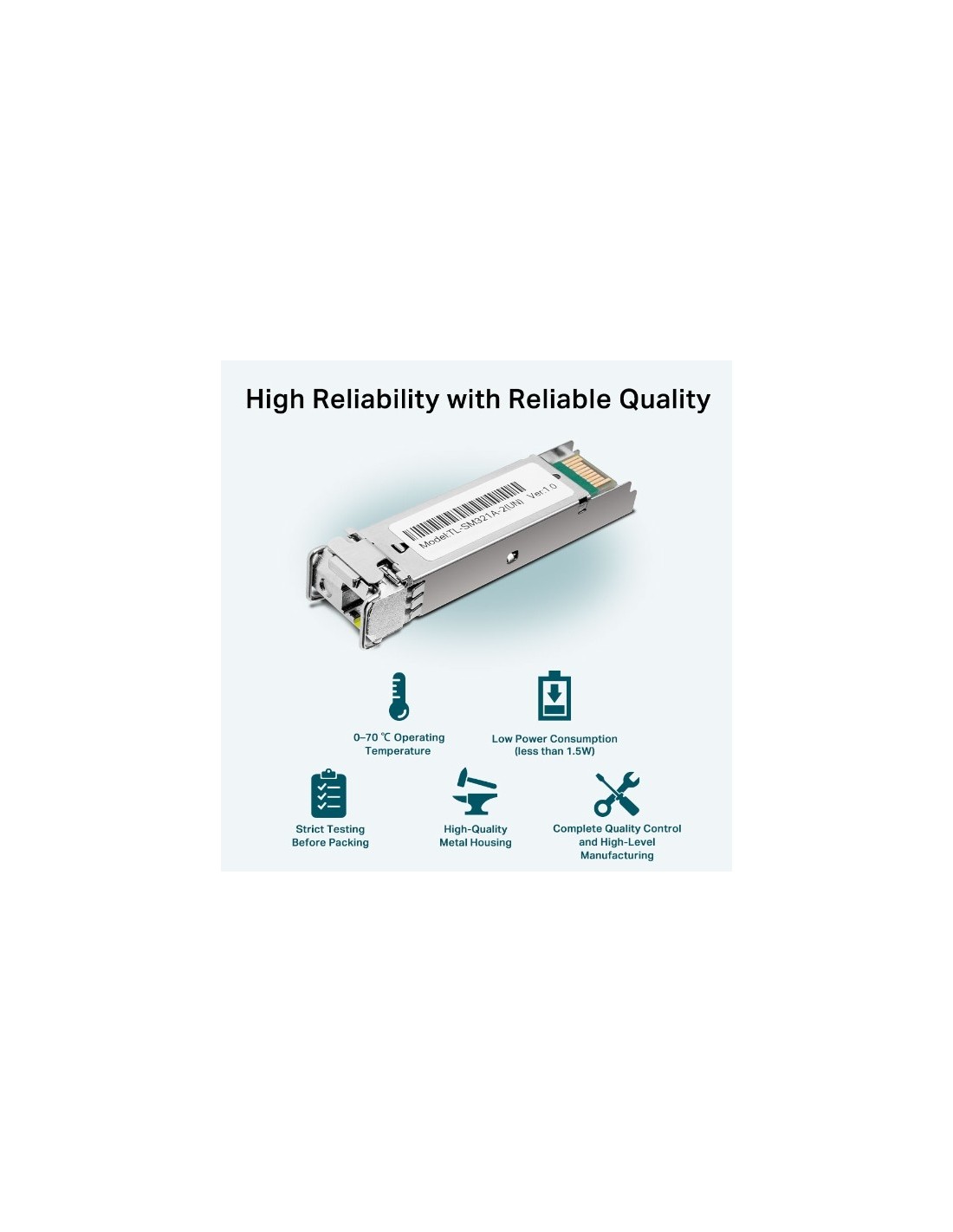TP-Link TL-SM321A. Tipo de transceptor SFP: Fibra óptica, Rango máximo de transferencia de datos: 1250 Mbit/s, Tipo de interfaz: SFP. Color del producto: Metálico. Voltaje de entrada: 3.3 V. Certificados de conformidad: RoHS, Certificación: CE, FCC. Cantidad por paquete: 1 pieza(s)