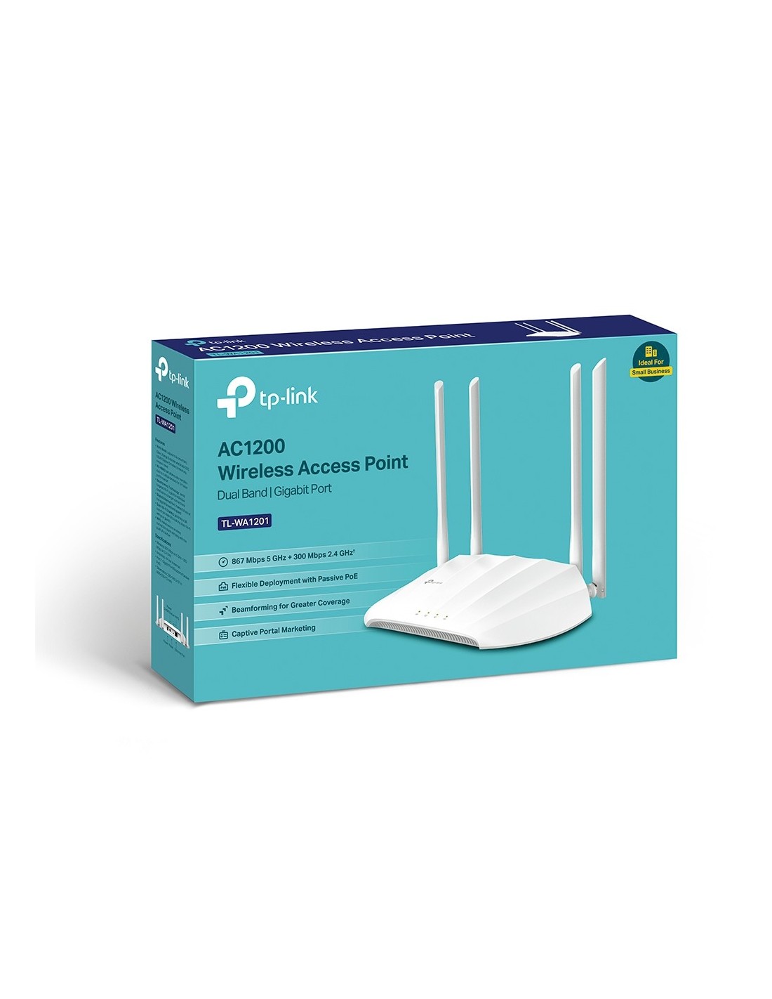 TP-Link TL-WA1201. 2,4 GHz, 5 GHz, Rango máximo de transferencia de datos: 867 Mbit/s. Algoritmos de seguridad soportados: 64-bit WEP, 128-bit WEP, WPA, WPA-PSK, WPA2, WPA2-PSK. Ethernet LAN, velocidad de transferencia de datos: 10,100,1000 Mbit/s. Energía sobre Ethernet (PoE). Color del producto: Blanco