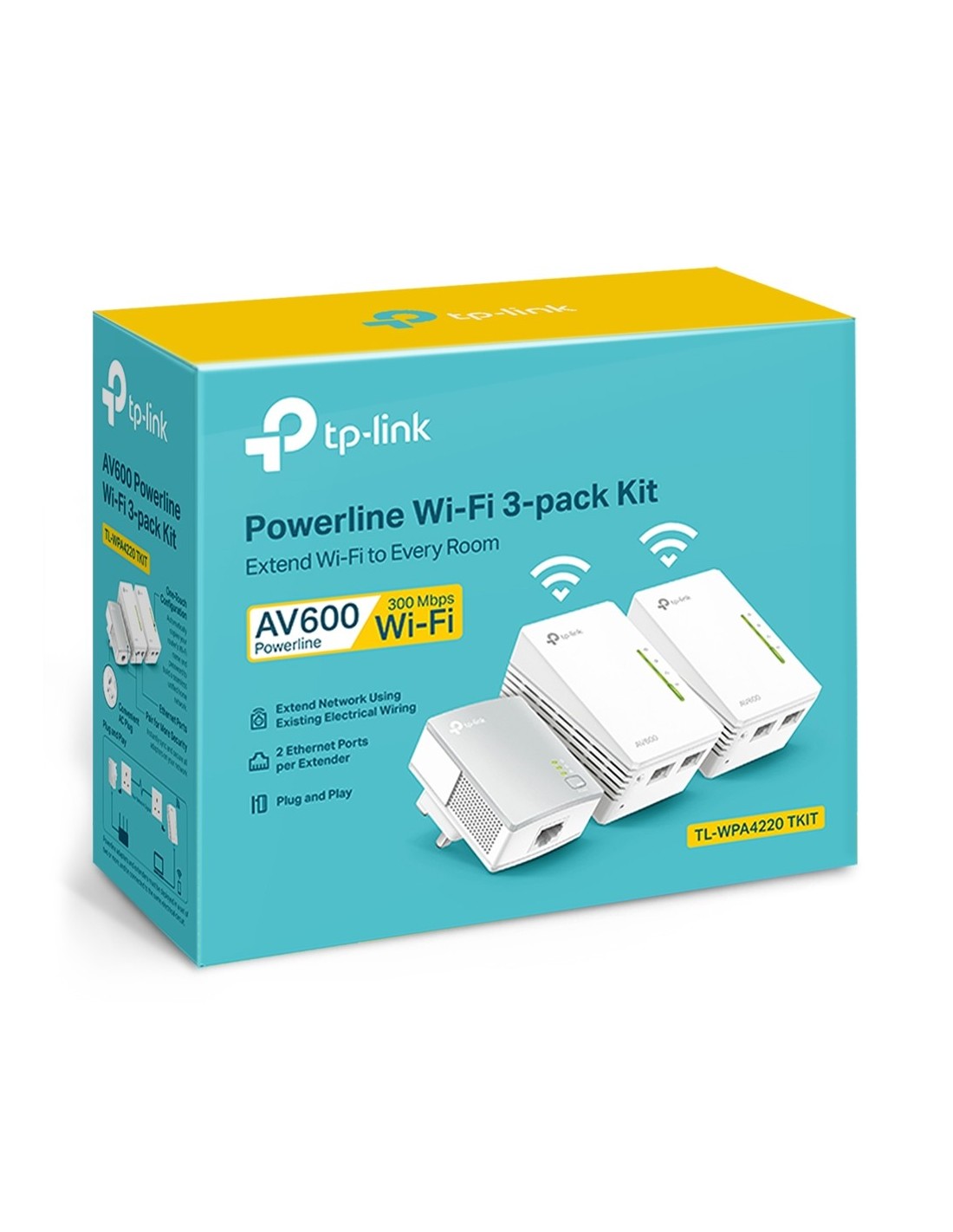 TP-Link TL-WPA4220T KIT. Tipo: Repetidor de red, Distancia de transferencia máxima: 300 m, Velocidad de transferencia de datos: 300 Mbit/s. Tecnología de cableado: 10/100Base-T(X), Estándares de red: IEEE 802.11b, IEEE 802.11g, IEEE 802.11n, IEEE 802.3, IEEE 802.3u, Wi-Fi estándares: 802.11a, 802.11b, 802.11g, Wi-Fi 4 (802.11n). Color del producto: Blanco, Tipo de montaje: Pared, Indicadores LED: Red, PLC, Poder, WLAN. Voltaje de entrada AC: 220 V, Frecuencia de entrada AC: 50 Hz, Consumo energético: 7,216 W. Ancho: 94 mm, Profundidad: 54 mm, Altura: 69,5 mm