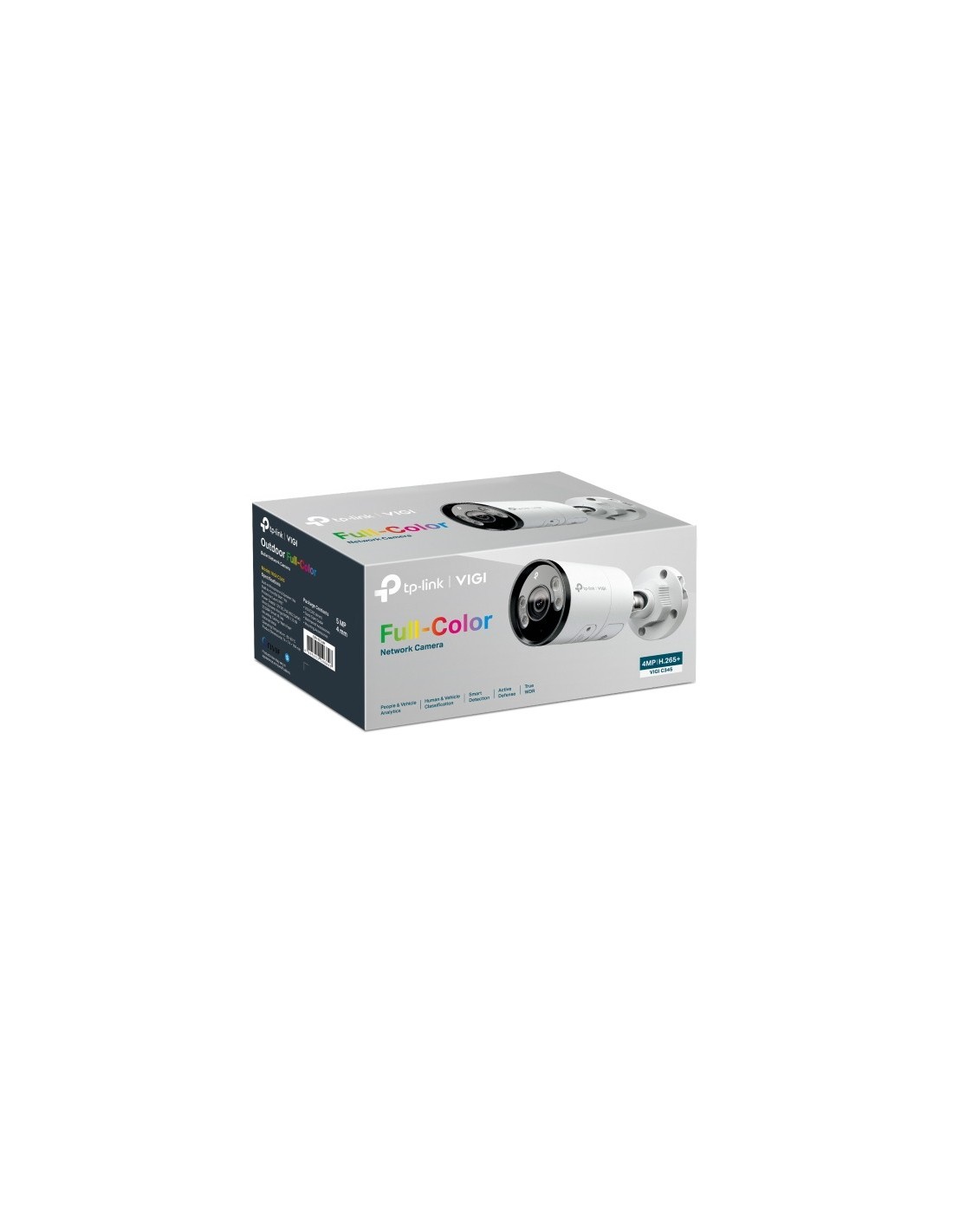 TP-Link VIGI C345. Tipo: Cámara de seguridad IP, Colocación soportada: Exterior, Tecnología de conectividad: Alámbrico. Tipo de montaje: Pared, Color del producto: Blanco, Factor de forma: Bala (forma). Iluminación mínima: 0,005 lx, Ángulo de rotación: 360°, Ángulo de visión de la lente, horizontal: 80.4°. Tipo de sensor: CMOS, Tamaño del sensor óptico: 25,4 / 2,7 mm (1 / 2.7"). Distancia de detección: 80 m, Distancia de observación: 33 m, Distancia de reconocimiento: 16 m