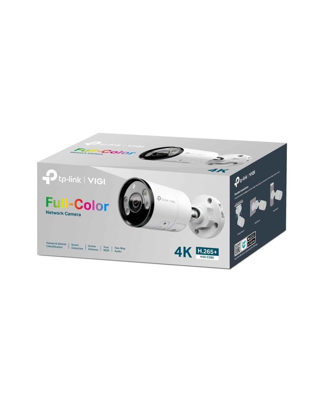 TP-Link VIGI C385. Tipo: Cámara de seguridad IP, Colocación soportada: Exterior, Tecnología de conectividad: Alámbrico. Tipo de montaje: Pared, Color del producto: Blanco, Factor de forma: Bala (forma). Iluminación mínima: 0,005 lx, Ángulo de rotación: 360°, Ángulo de visión de la lente, horizontal: 111.4°. Tipo de sensor: CMOS, Tamaño del sensor óptico: 25,4 / 2,7 mm (1 / 2.7"). Distancia de detección: 85 m, Distancia de observación: 35 m, Distancia de reconocimiento: 17 m