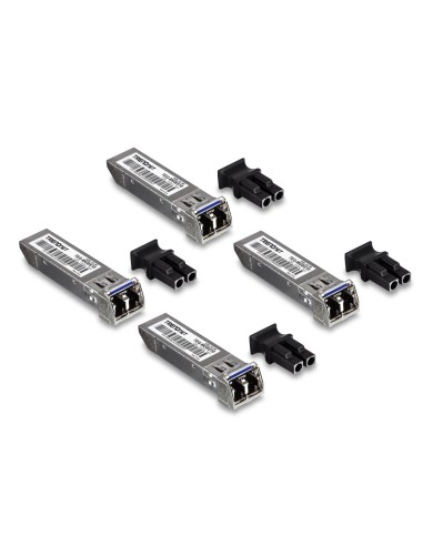 El módulo LC monomodo SFP, Pack de 4, de TRENDnet, modelo TEG-MGBS10/4, incluye cuatro modulos SFP Gigabit de fibra que son compatibles con las ranuras SFP estándar presentes en switches de red y convertidores de medios. Cada módulo SFP monomodo está equipado con una interfaz de conexión de fibra dúplex LC y admite conexiones de fibra monomodo Gigabit para aplicaciones de redes de larga distancia.
