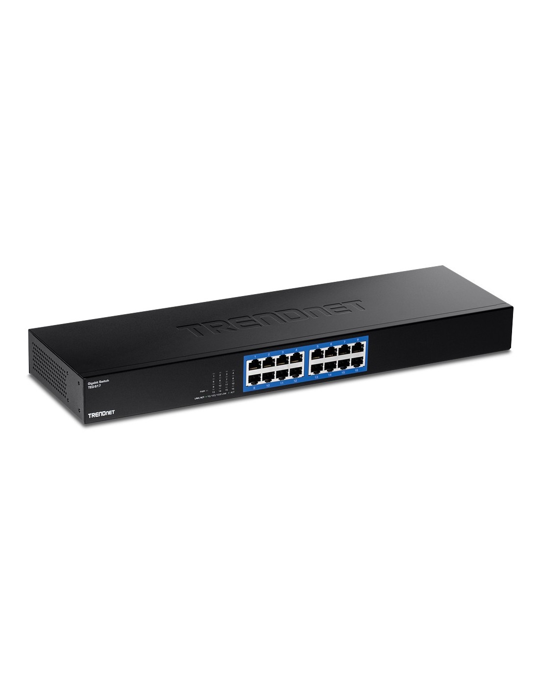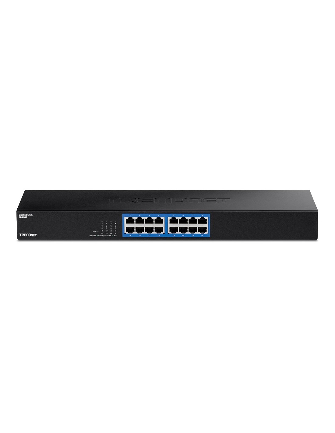 Trendnet TEG-S17. Puertos tipo básico de conmutación RJ-45 Ethernet: Gigabit Ethernet (10/100/1000), Cantidad de puertos básicos de conmutación RJ-45 Ethernet: 16. Bidireccional completo (Full duplex). Tabla de direcciones MAC: 8000 entradas, Capacidad de conmutación: 32 Gbit/s. Estándares de red: IEEE 802.3, IEEE 802.3ab, IEEE 802.3u, IEEE 802.3x. Montaje en rack