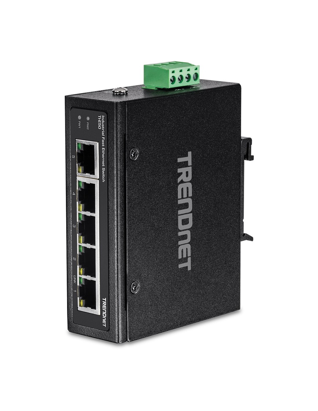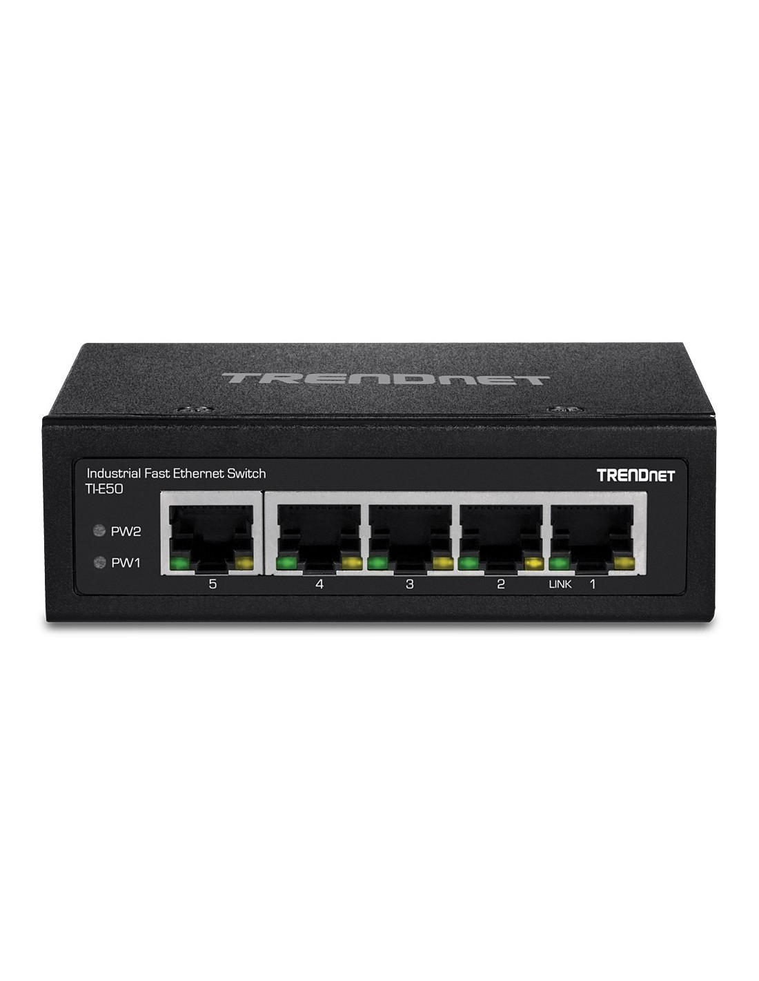 Trendnet TI-E50. Tipo de interruptor: No administrado. Puertos tipo básico de conmutación RJ-45 Ethernet: Fast Ethernet (10/100), Cantidad de puertos básicos de conmutación RJ-45 Ethernet: 5. Bidireccional completo (Full duplex). Tabla de direcciones MAC: 1000 entradas, Capacidad de conmutación: 1 Gbit/s. Estándares de red: IEEE 802.3, IEEE 802.3ab, IEEE 802.3u, IEEE 802.3x. Voltaje de entrada DC: 12 - 56 V. Montaje de pared